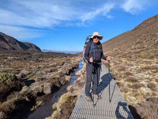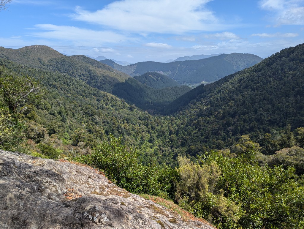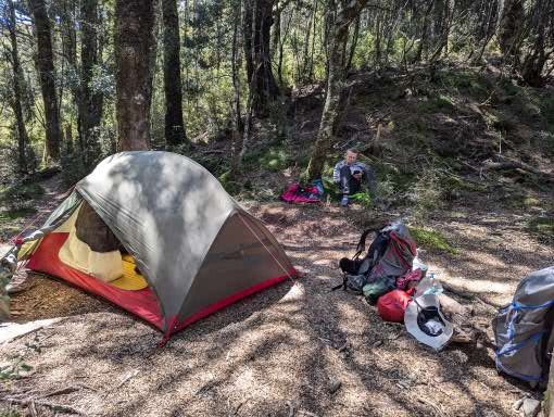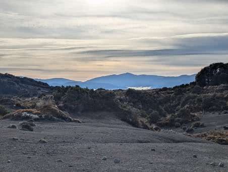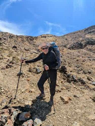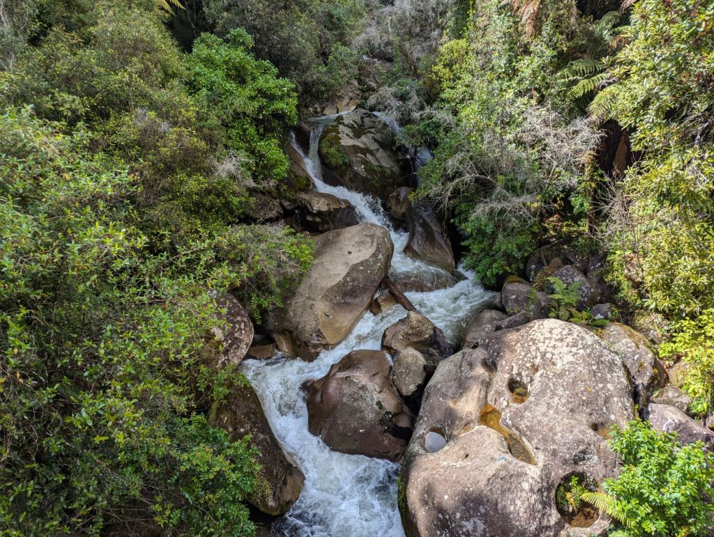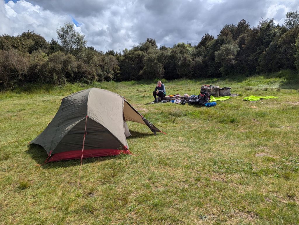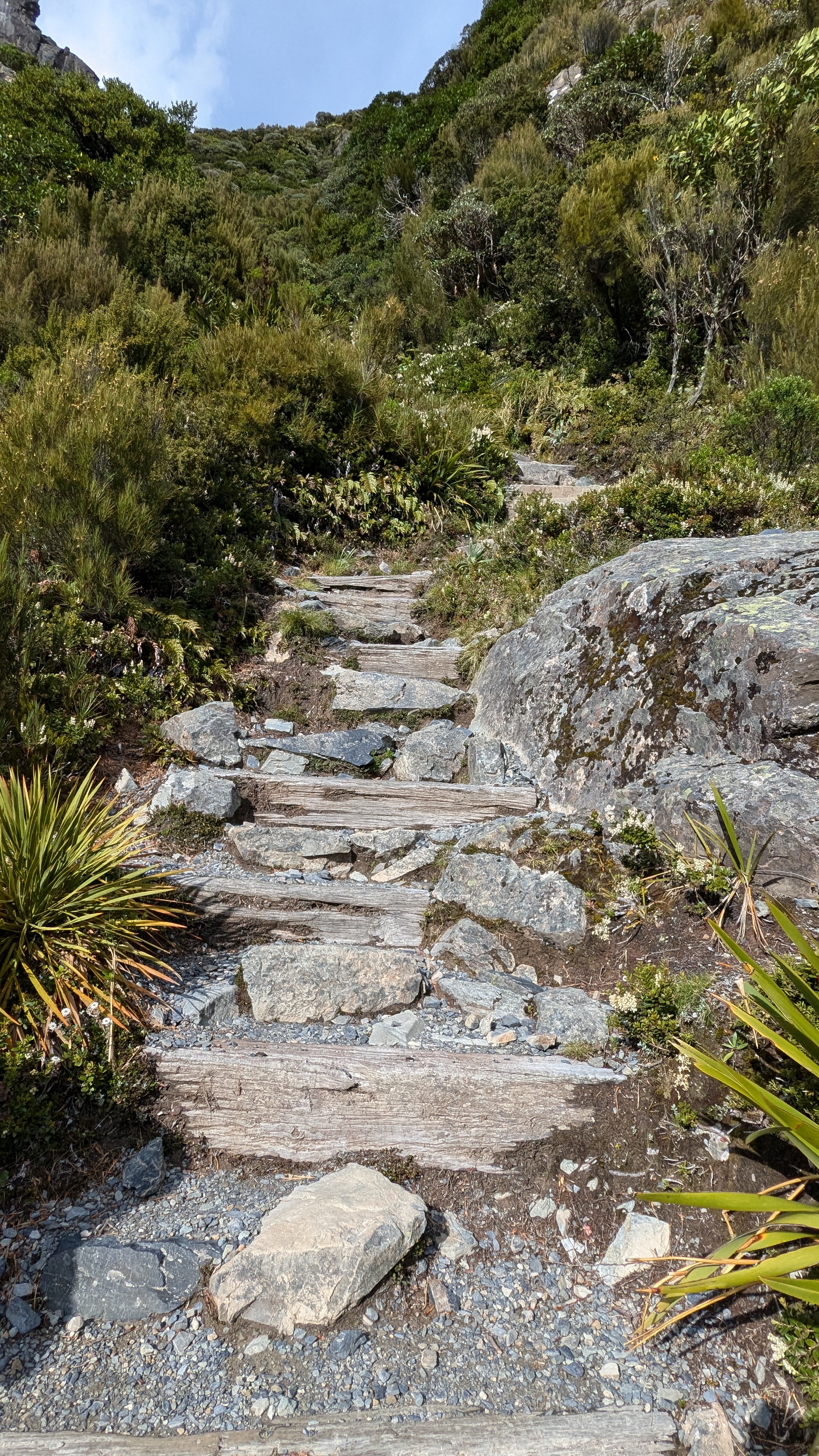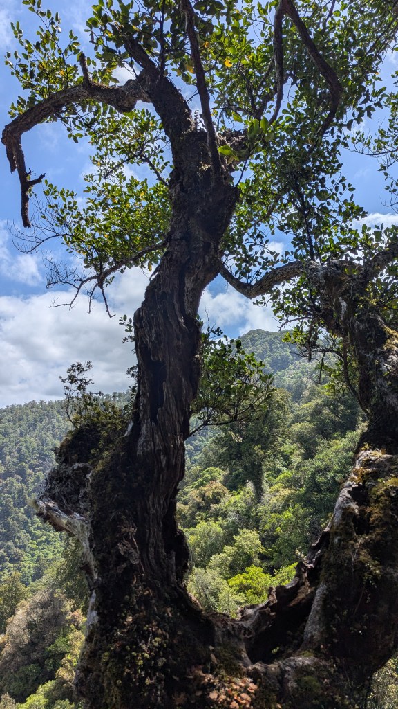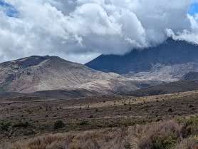 Walking up a track in a forest with no views with continuous water running underfoot does not sound too attractive, but actually it was very pleasant. By this stage our fitness had improved, the forest protected us from the wind and so walking uphill was not a real effort as we were constantly conversation with people who were now friends, distracted by birds and plants. When we emerged out of the forest, the wind and rain hit us, and the rain turned to something near hail.