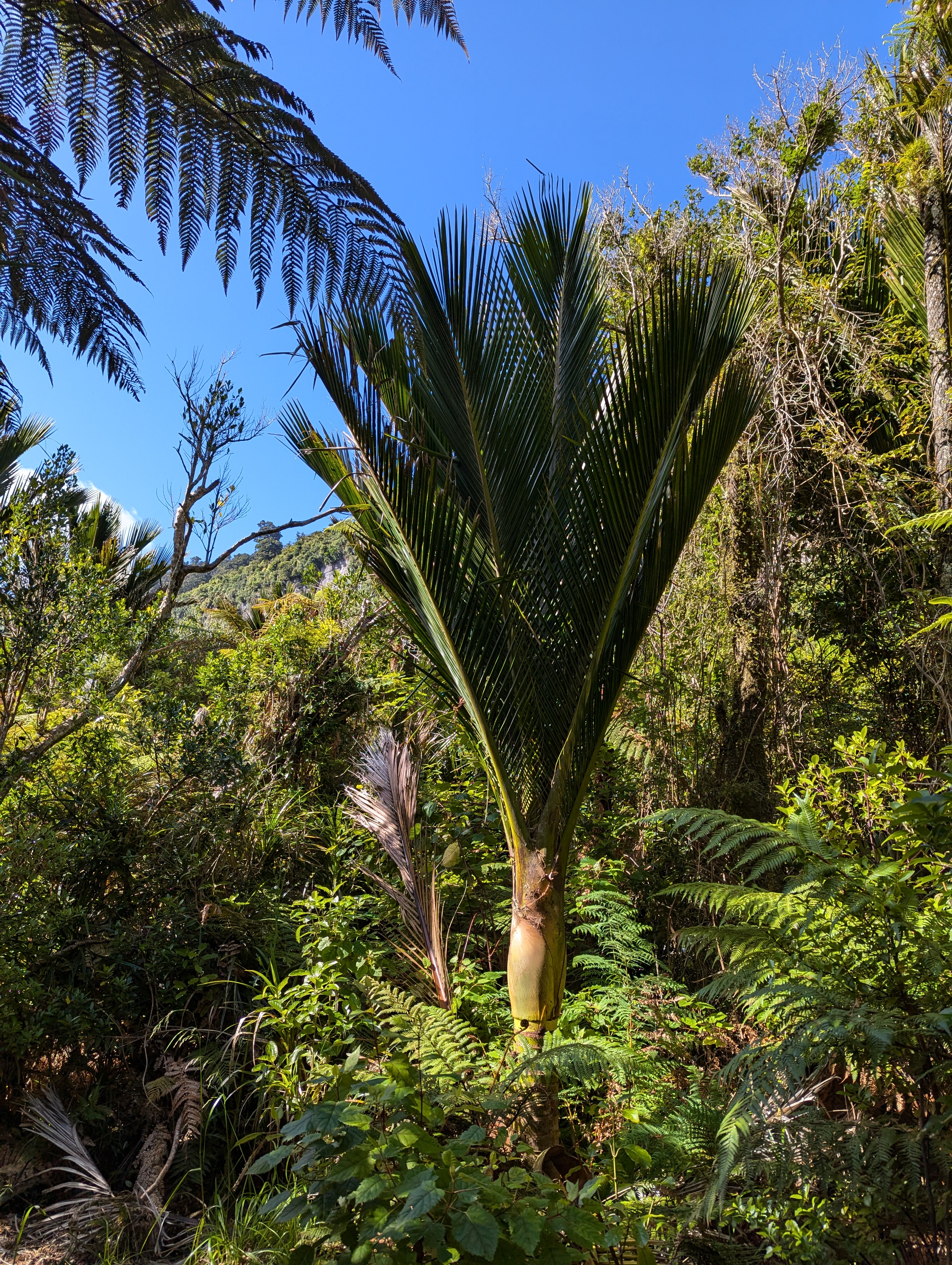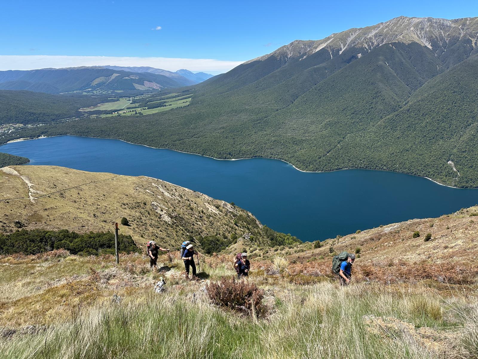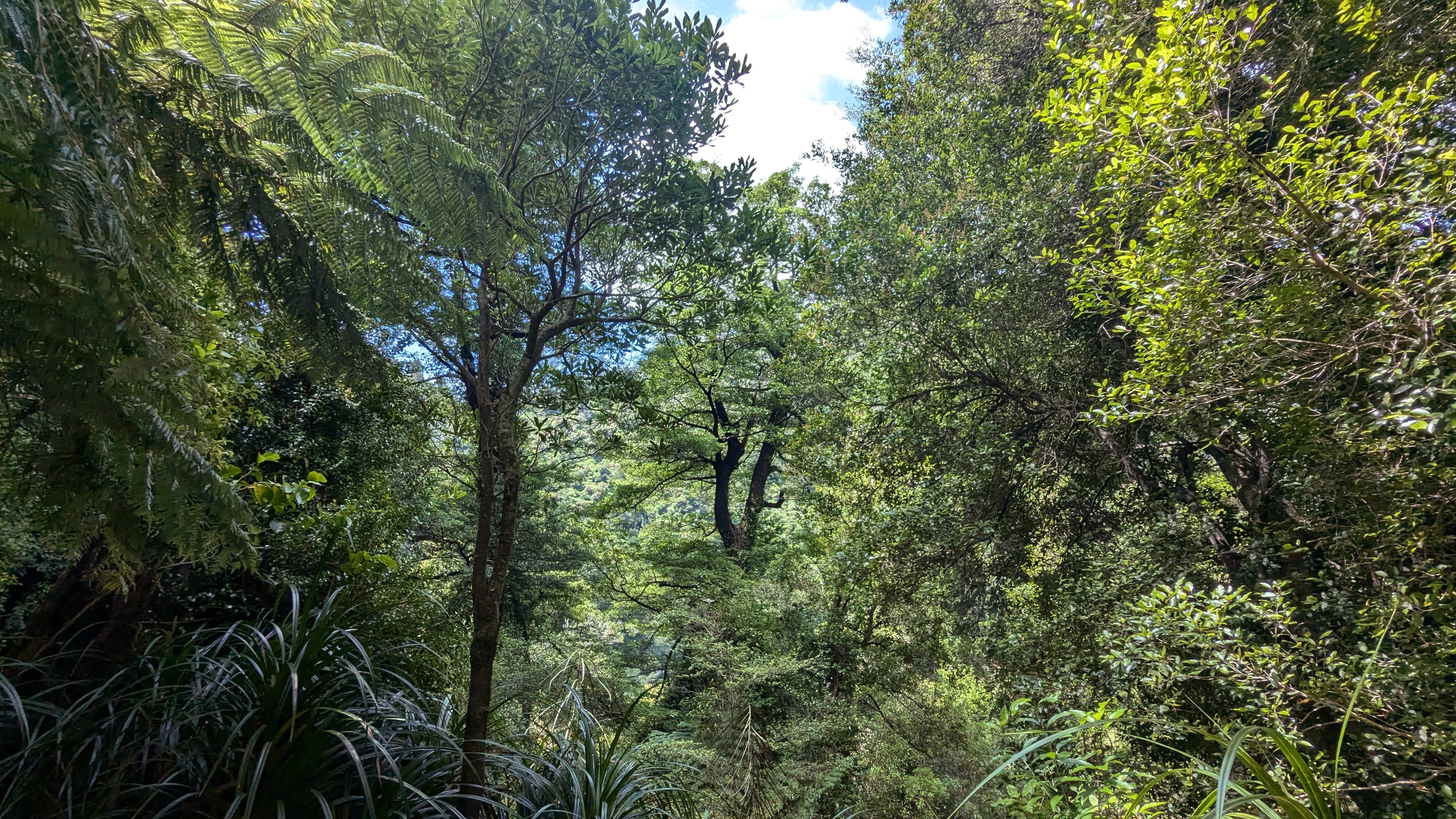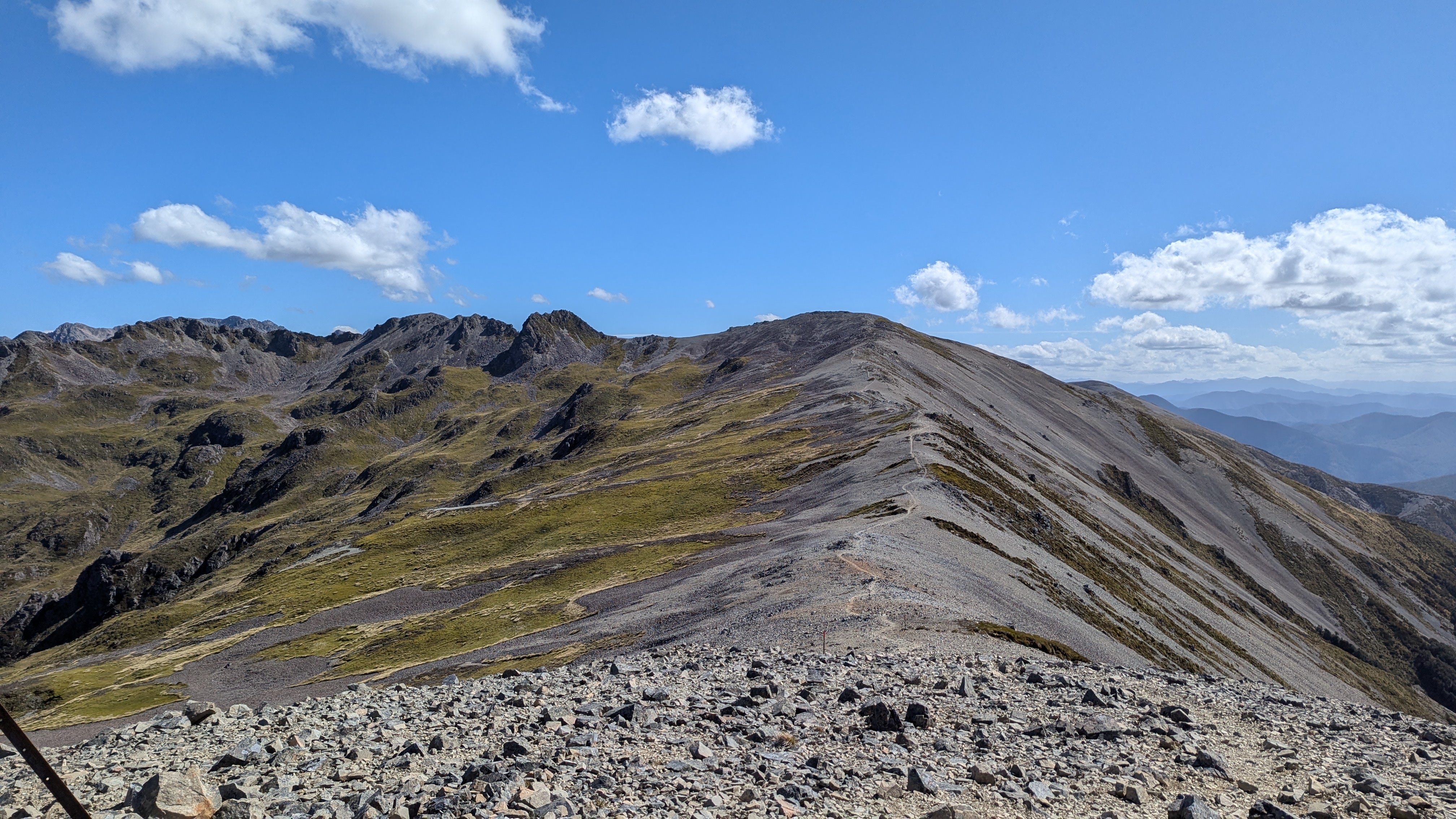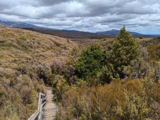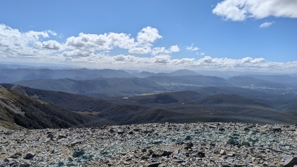 Walking up a track in a forest with no views with continuous water running underfoot does not sound too attractive, but actually it was very pleasant. By this stage our fitness had improved, the forest protected us from the wind and so walking uphill was not a real effort as we were constantly conversation with people who were now friends, distracted by birds and plants. When we emerged out of the forest, the wind and rain hit us, and the rain turned to something near hail.