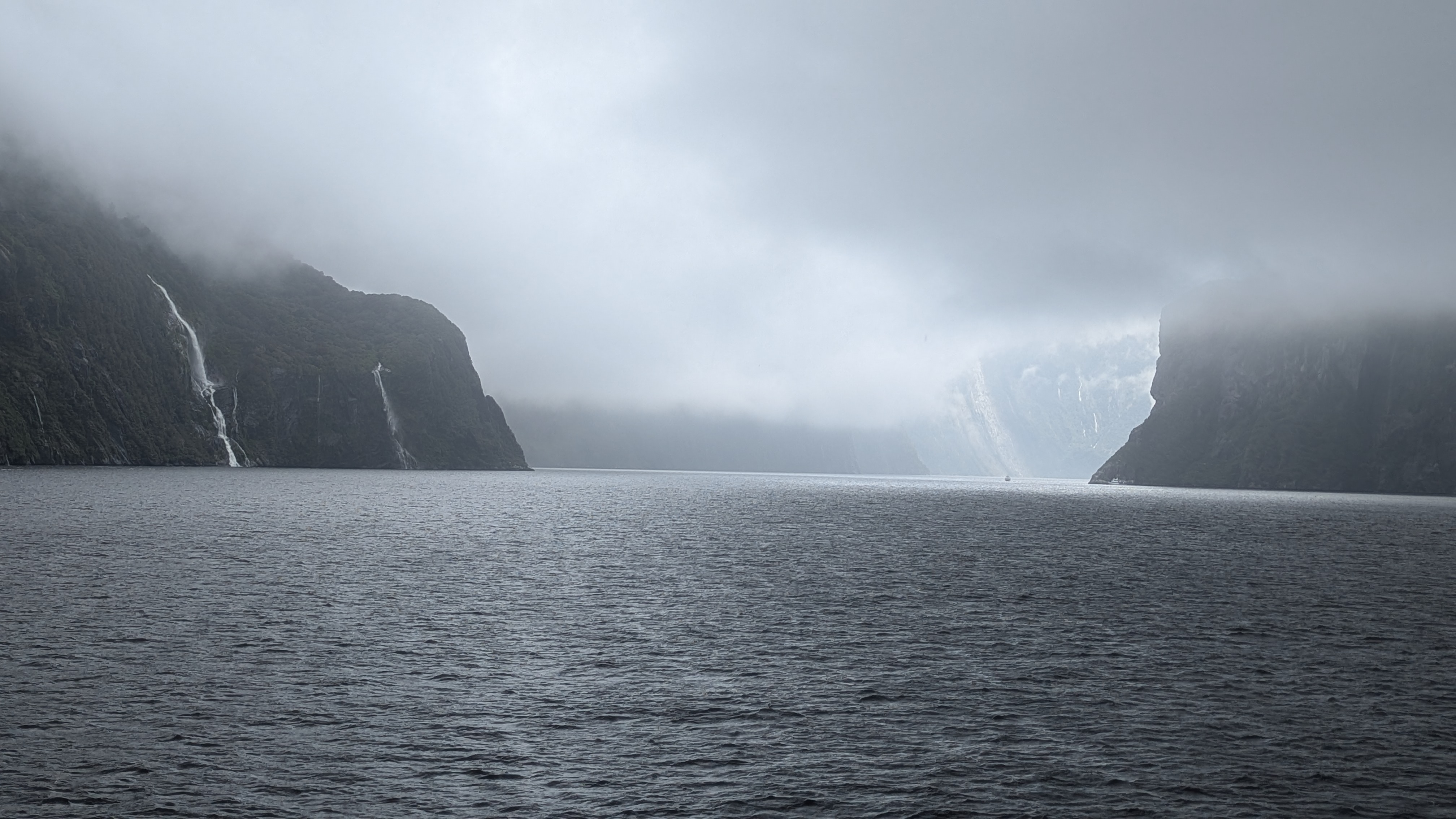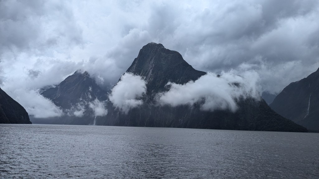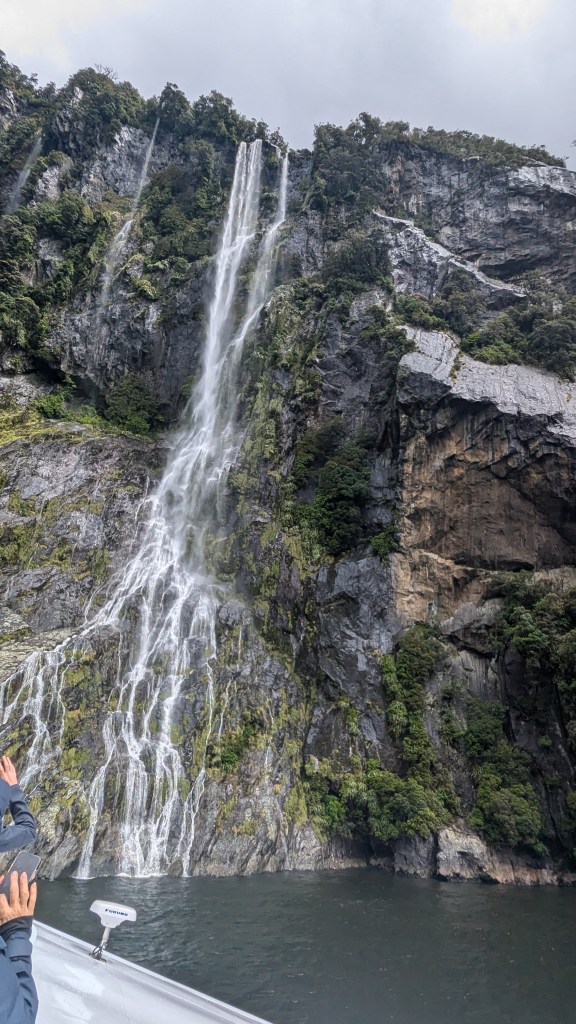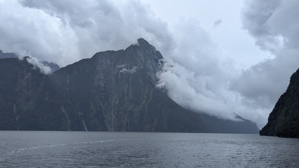 We felt a bit “processed” as we lined up to take a boat up the sound, but that feeling soon disappeared as we gazed at the awesome rocks. The fjord is 10 miles long so it was a pleasant couple of hours cruising up and down, looking up at the rock formations. There were numerous waterfalls – but they come and go depending on the rain (and it rains a lot here- about 7m of rain a year). These waterfalls start within a couple of hours of rain, and then stop within a day of the rain ceasing. It had been really wet in the hours before we visited so they were all in full flow, even though it was largely dry when we were on the boat.