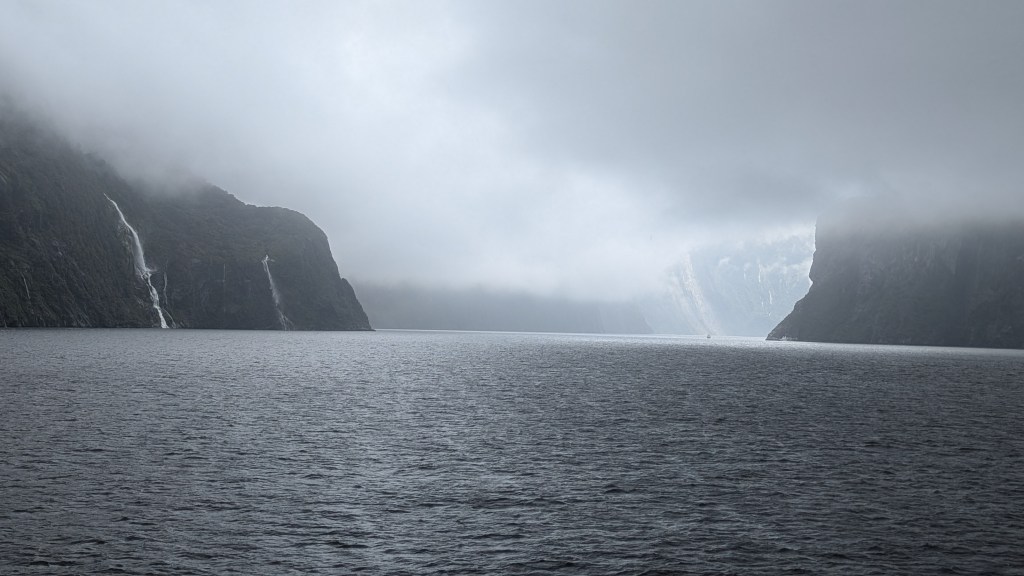 The amble down the hill was, of course, easier but felt longer. The rain continued and we got out of our wet weather gear at the bottom. Then we were driven over the mountain, through a tunnel and into the valley leading the town, Milford Sound, which is at the start of the glacial valley called the “Milford Sound”.