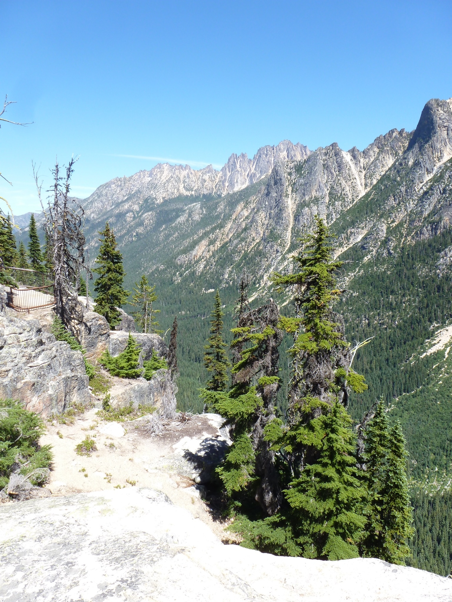 The reflections in the lake in the early morning sun were beautiful so we paused for photos and then were into a stiff climb – one of the steepest of the day in fact but a bit cruel on unwarmed up legs. However views over Diablo Lake and the surrounding mountain soon opened up and were stunning.
