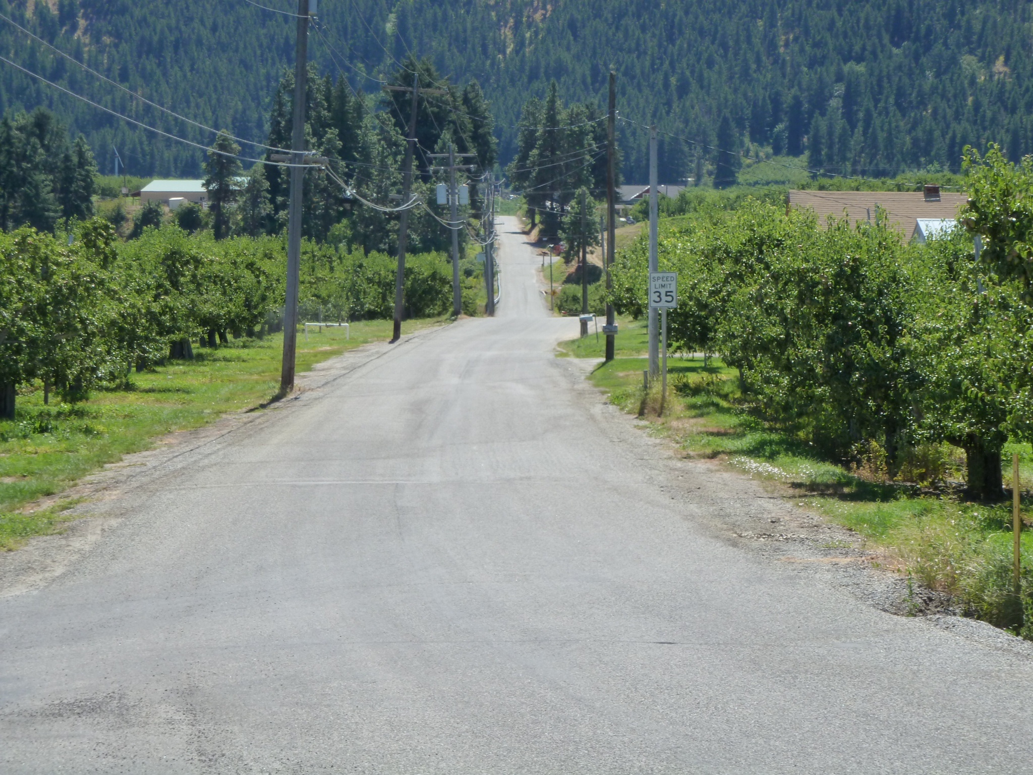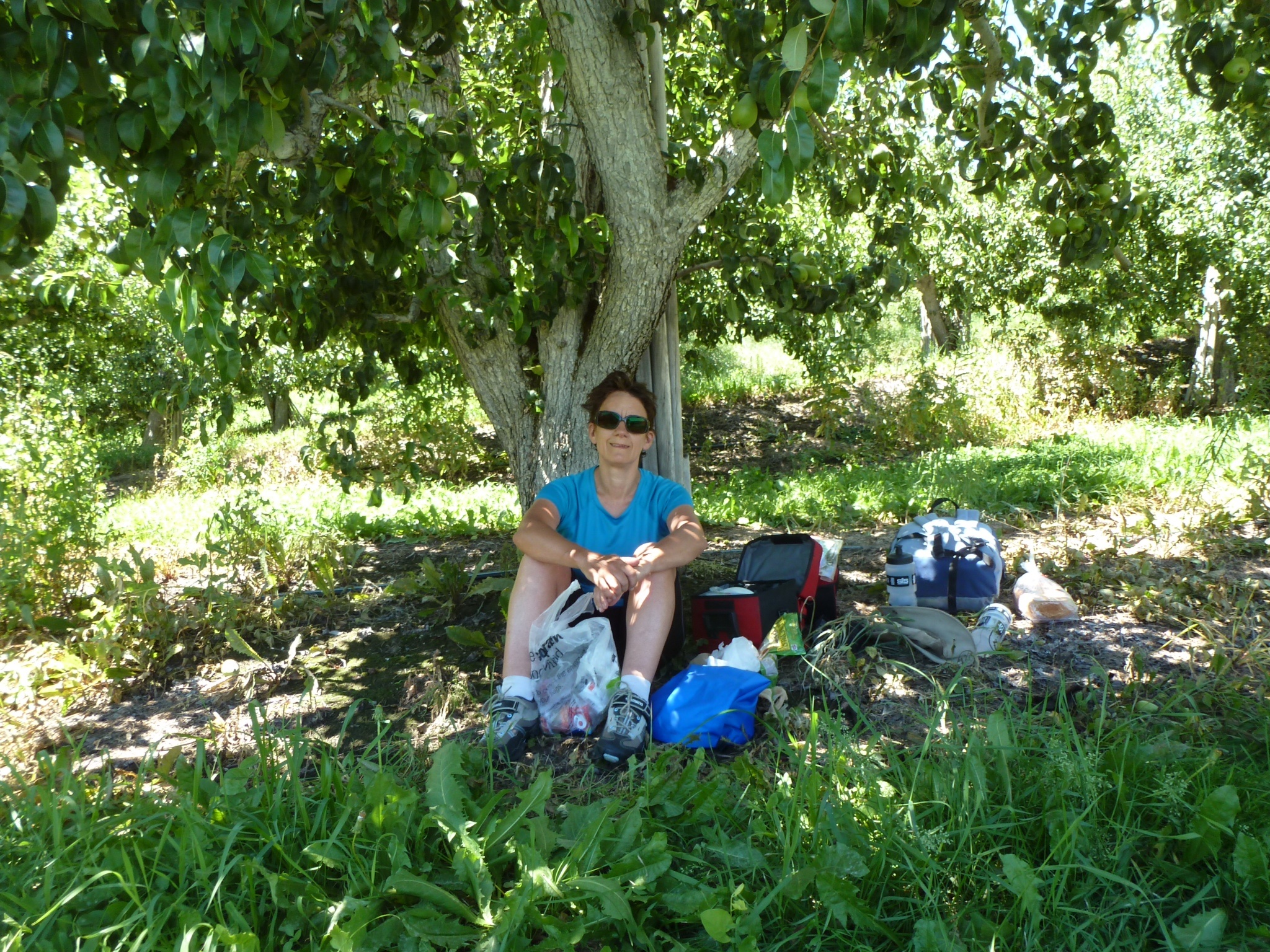 We came back out to the heat and traffic, but soon left to go through a delightful little town called Cashmere, where we stopped for bread. Then we climbed up narrow roads, and lunched under a pear tree in an orchard beside the road. This is fruit country where the lack of rain water is made up for by fantastic irrigation systems, with the water from the mountains being recycled to grow crops. Occasionally we would pass an orchard and a badly directly sprinkler would cover us with water. It was fantastic and tempting to stop and wait for another soaking.