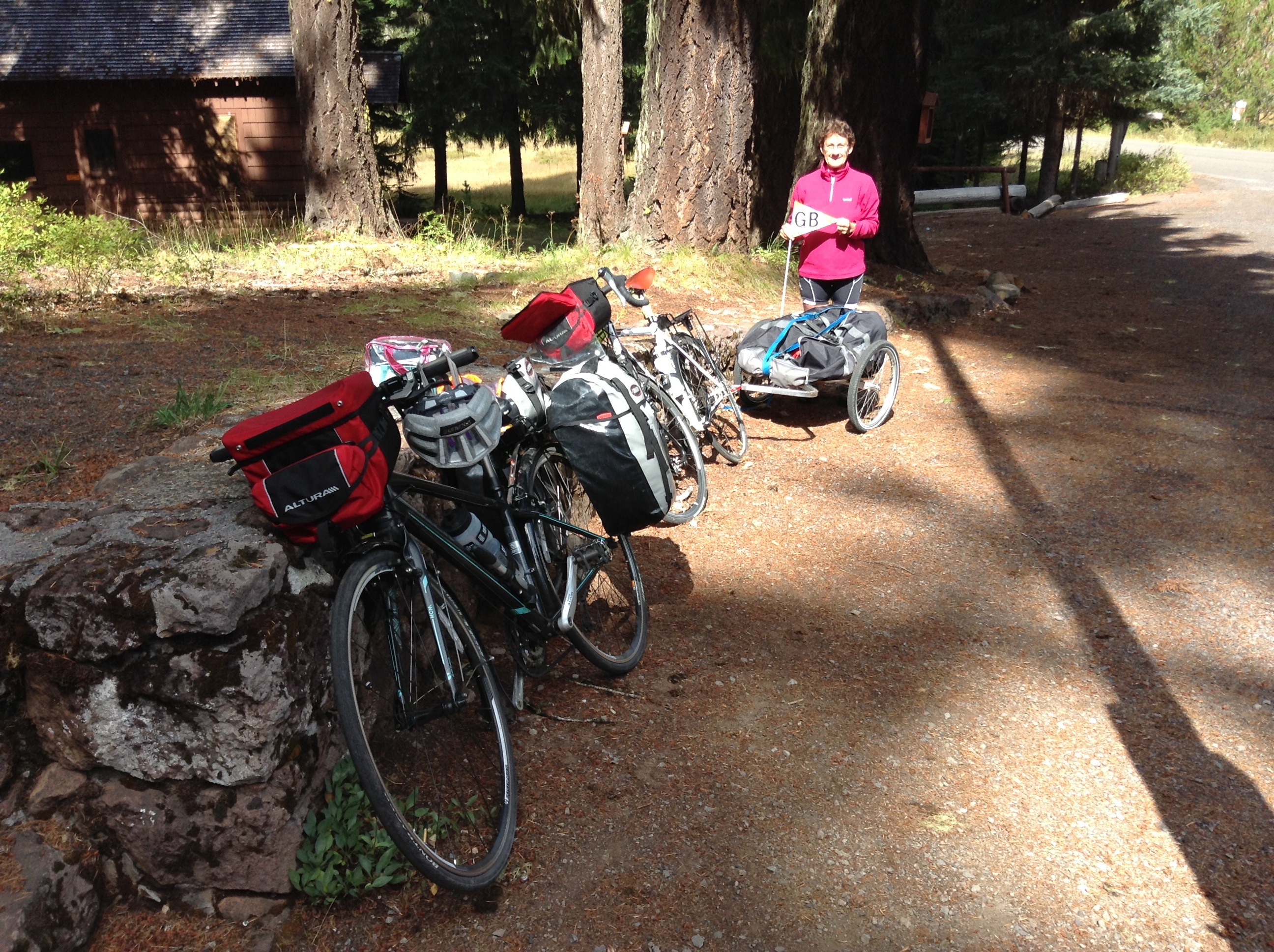 Although it ad been 90 and sunny in Bend (we can see why Wayne and Doris had chosen to live there in part for the climate), it was cloudy in the mountains and at that moment it started to drizzle. Come on – this was too like England! We didn’t hang around too long before setting up. We have a different set up this time – David has a luggage trailer rather than panniers. This has the advantage of being more stable and better able to divide out the load. So David takes a bit more and iI take a bit less to even out our speeds a bit better. We had trialled it in England and it had worked well. So off we set, complete with trailer flag with a GB sticker on and at that point the drizzle stopped. We were off! It felt good – in fact it felt better than good.