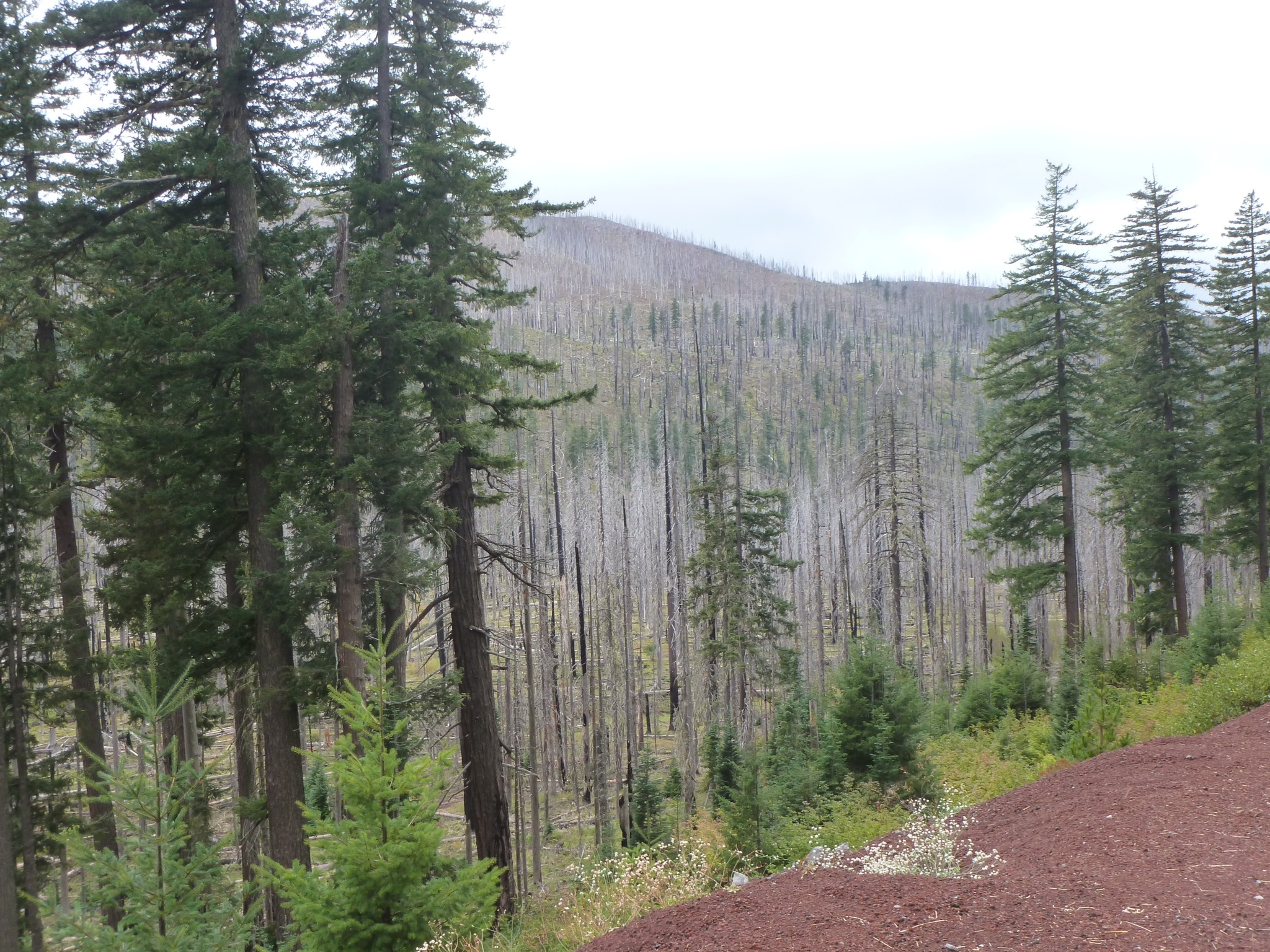 We had woken at 5.30, as the jet lag still had its effect, but it was fine. I made coffee in the dark and then the light emerged at about 6. We ambled around and I enveloped myself in ninetheeth century France as I read Les Miserables (and sorry Sue Holli – in English although I am sure it is better in the original French). We packed up and had the delight of a 10 mile descent alongside the river Breitentbush to the town of Detroit. It did not have a sign saying saying “Welcome to the solvent Detroit” but was a thriving little hamlet at the north end of a large lake. The trees had an autumnal feel and the leaves are turning. It was very peaceful as we began the long slow climb up to Santiam Pass. The weather was mixed, but dry to begin with.