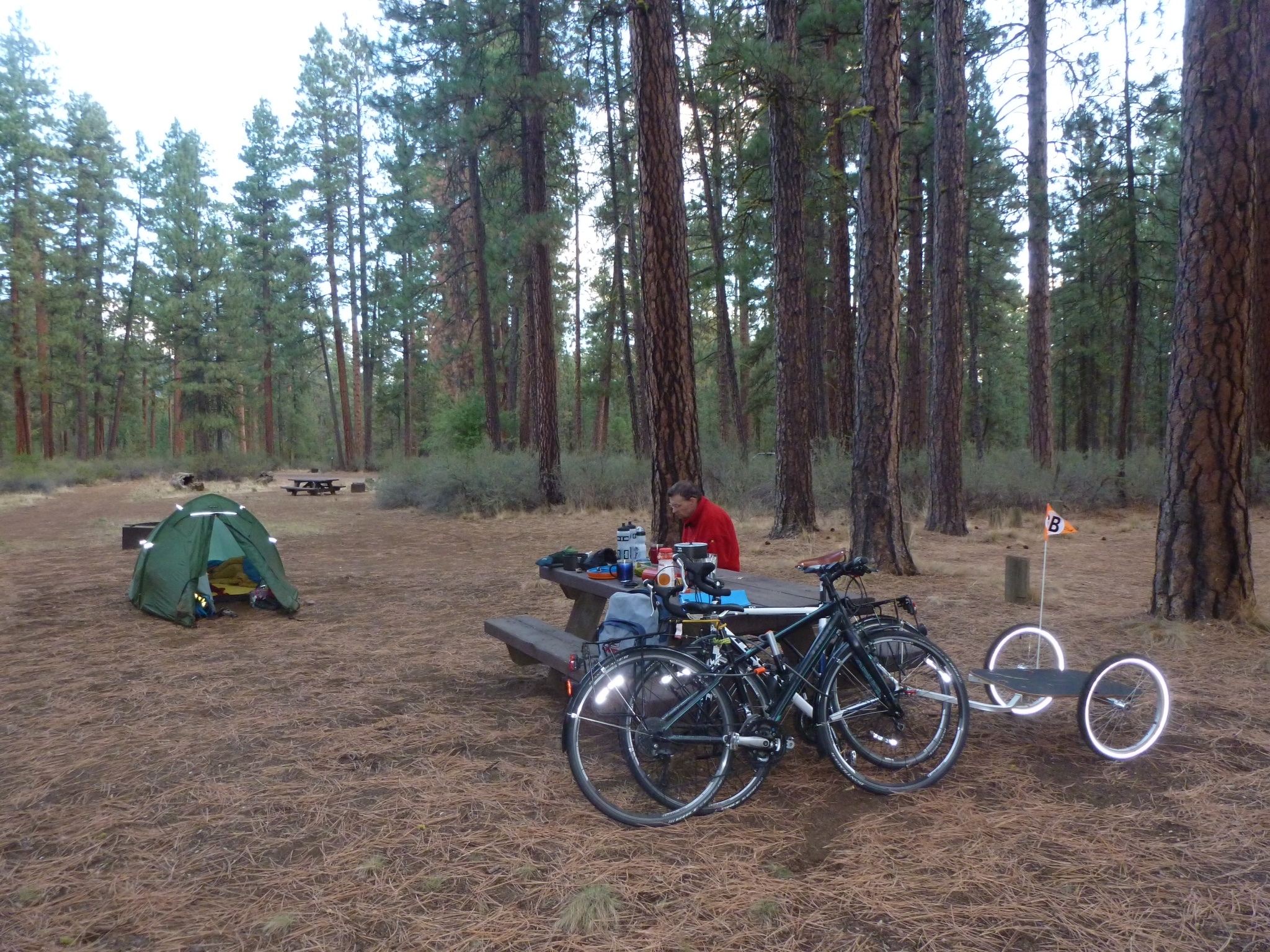 Eventually we pulled ourselves away and began riding again along Highway 22. More up, and then more up and so on. The road followed the North Santiam river (logical as it was a river on the north side of the Santiam Pass). There was water on the road, and the lorries sprayed us as they passed. Lots of cars coming the other way hooted in support as we slogged up the road. About half way up we came across a lovely young Dutch couple on bikes (who stopped to cook up lunch) who were doing the same route as us. They were loaded with panniers (as we had been on part 1) and asked about the trailer. I was cautious in not singing its praises too much becasue they had thought about bringing one and decided against it. The most I could say is that it works for me – which it certainly does. At one point today I took a copuple of extra things from Bernie’s panniers to even out the speeds. As she gets fitter I will surupticioulsly slip them back in to weigh her down but that seems the right thing to do at the moment. We said our goodbye’s to the Dutch couple (sorry no names or photos because brain not in gear) and continued to climb, following the river valley.