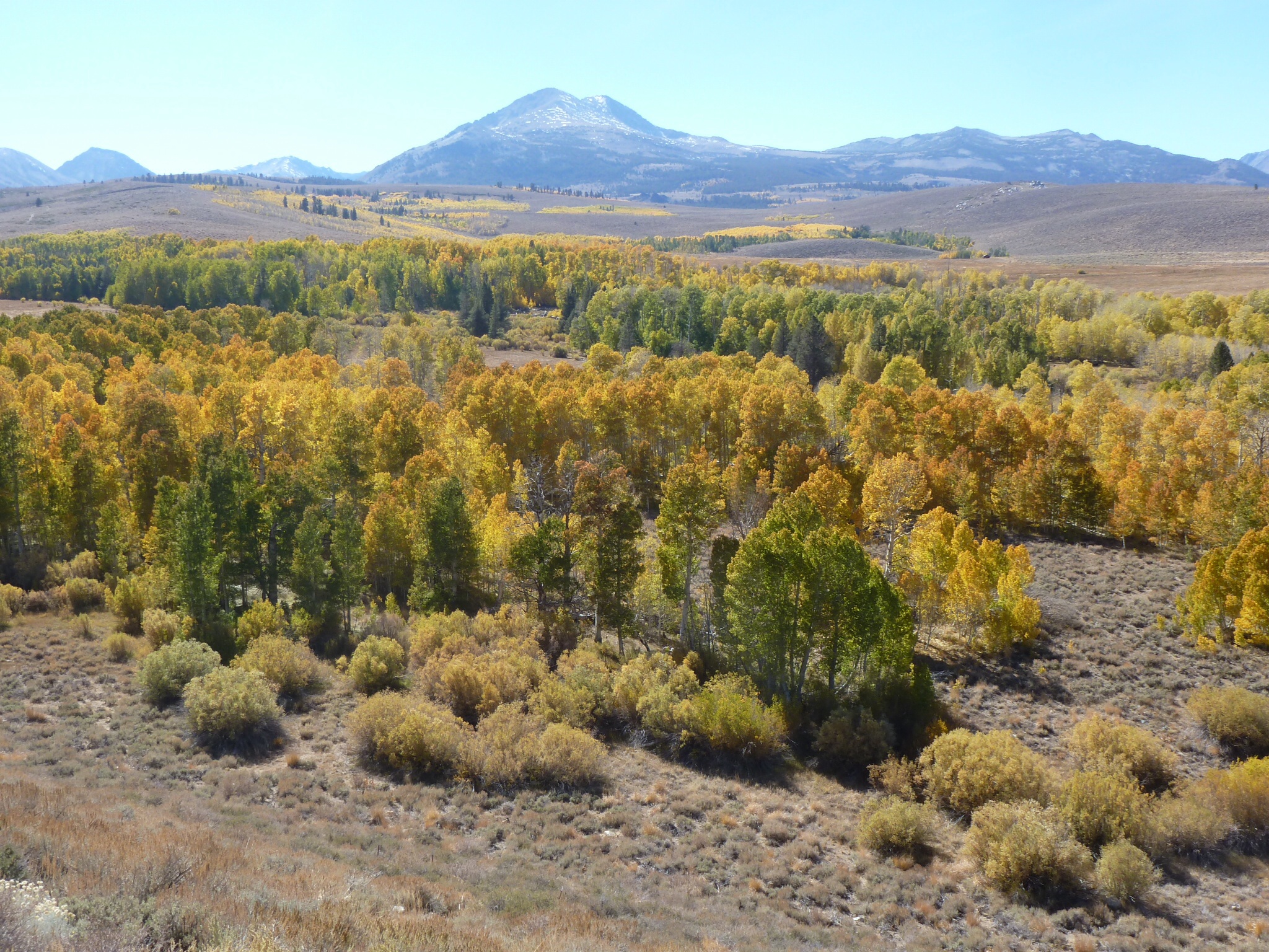Despite the local predictions, the road up to Conway Summit (8143 ft) was a delightful 13 mile ride up a valley road. The panorama changed as we climbed. We picked a time to travel this road when the autumn colours on the trees were at their very best, glinting yellows and gold colors in the afternoon sun and topped off by a peak that was showing the first dusting of snow for the season.