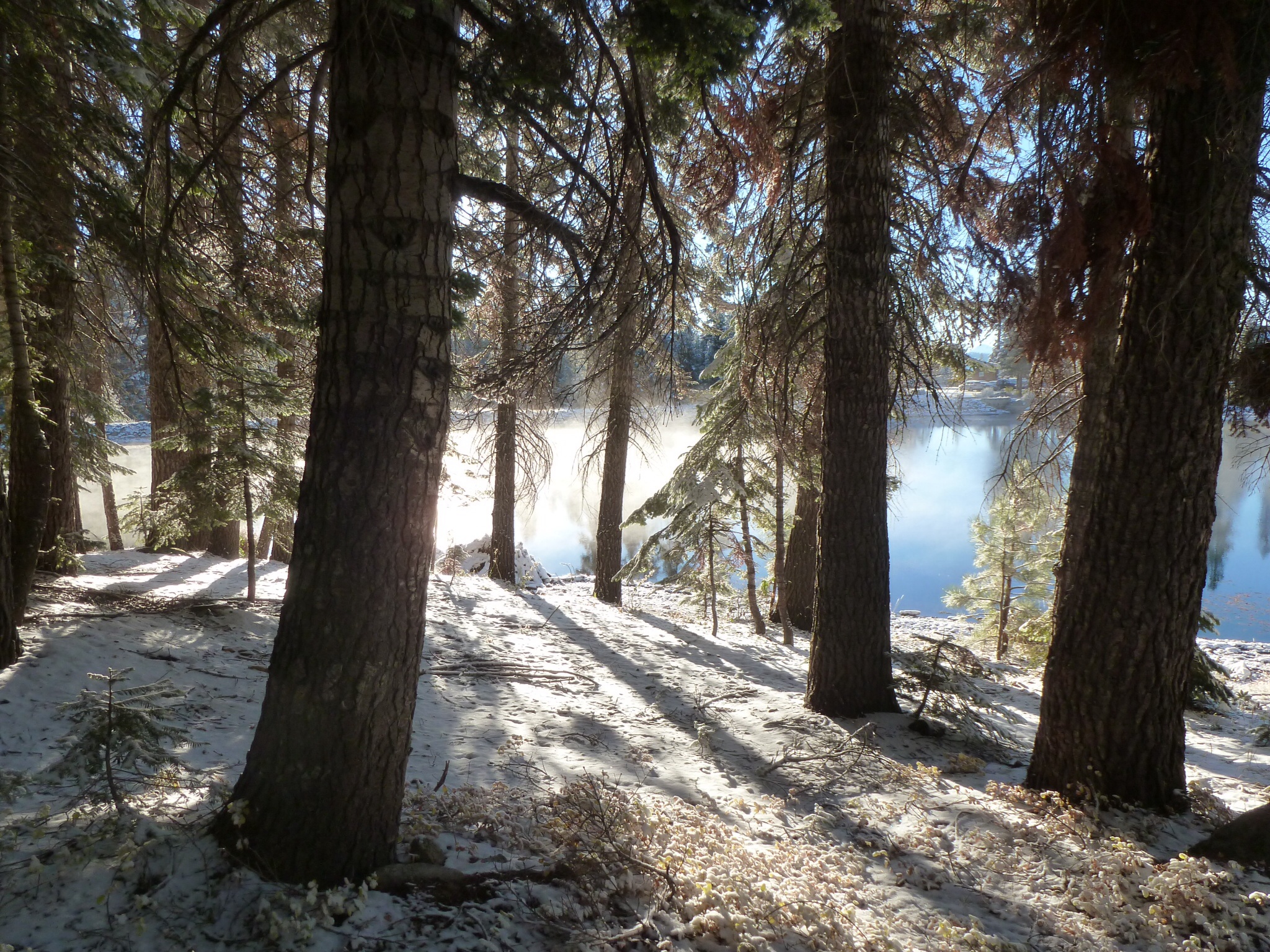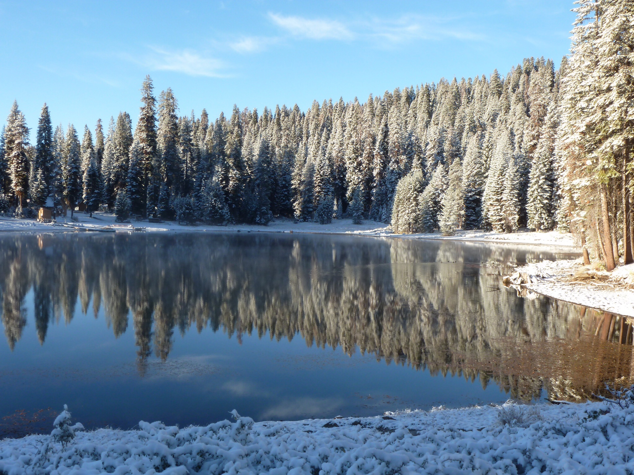 We woke at Camp Montecito and saw that the snow had come down overnight.  There was a coatiing of about 2 inches on the roads, the trees and the buildings.  It had frozen overnight (we were at 7400 feet) and it was certainly not weather to set off on the bikes! So we ambled out and took photos of the lake and the trees.