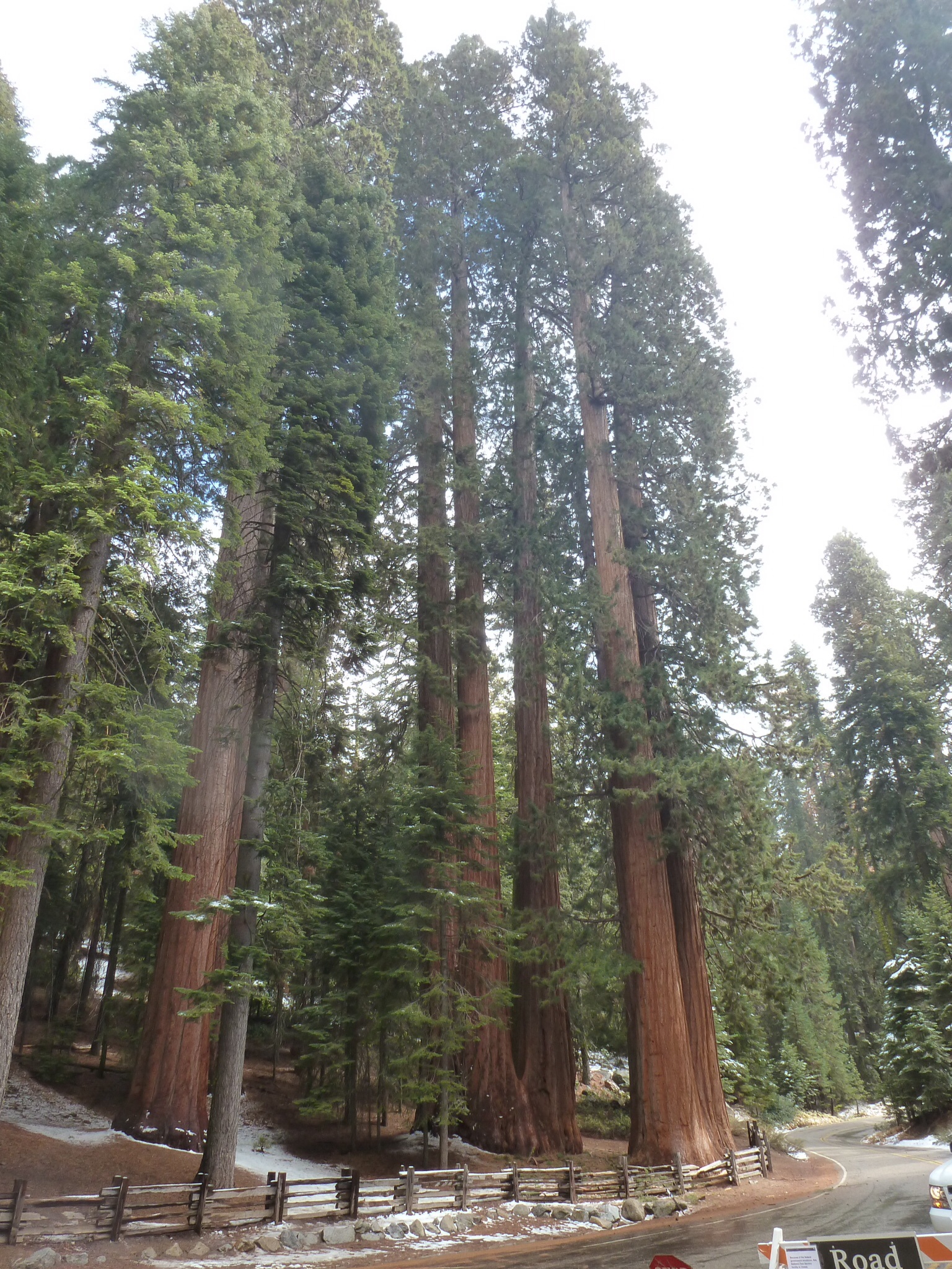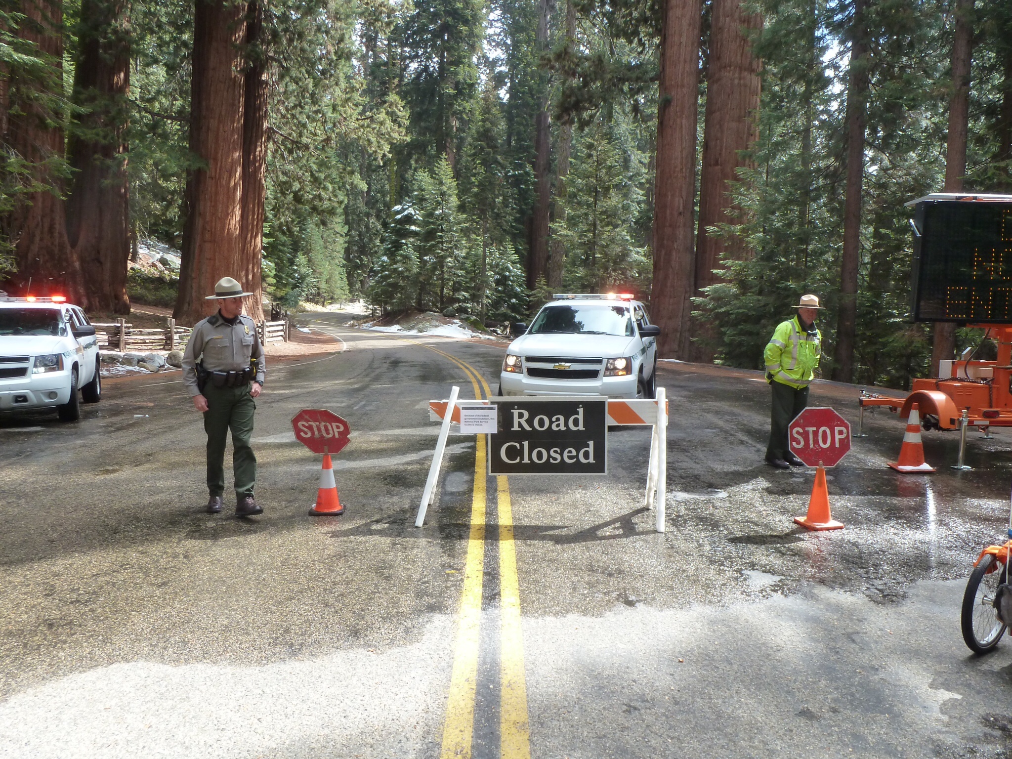 We got our thermals and gloves on and set out on the road going South.  It was tricky to get to the main road but after that was mostly OK.  There was the occasional secluded part of the road where the ice persisted but the sun was out and we made pretty good progress until we got to the entrance back into the National Park.  After about a mile there was a road block and a ranger (with a gun) who told us in no uncertain terms that the road was closed.  All efforts to persuade him that we should be let through to cycle down to Three Rivers fell on deaf ears.  The park was closed, the road was closed and that was that!  I don’t wish to give the impression he was unhelpful but he had his orders and, in the nicest possible way, made it clear that he was not going to make an exception for a couple of English cyclists.  However, in a gesture that was astonshingly kind – he offered to get a pickup and take us back to teh entrance to Kings Canyon Park.  That saved us several hours cycling and a 1000 foot climb.  We accepted and then waited for 40 minutes whilst he was relieved by a colleague (also with a gun and a Tasar) who was equally bound by the rules!