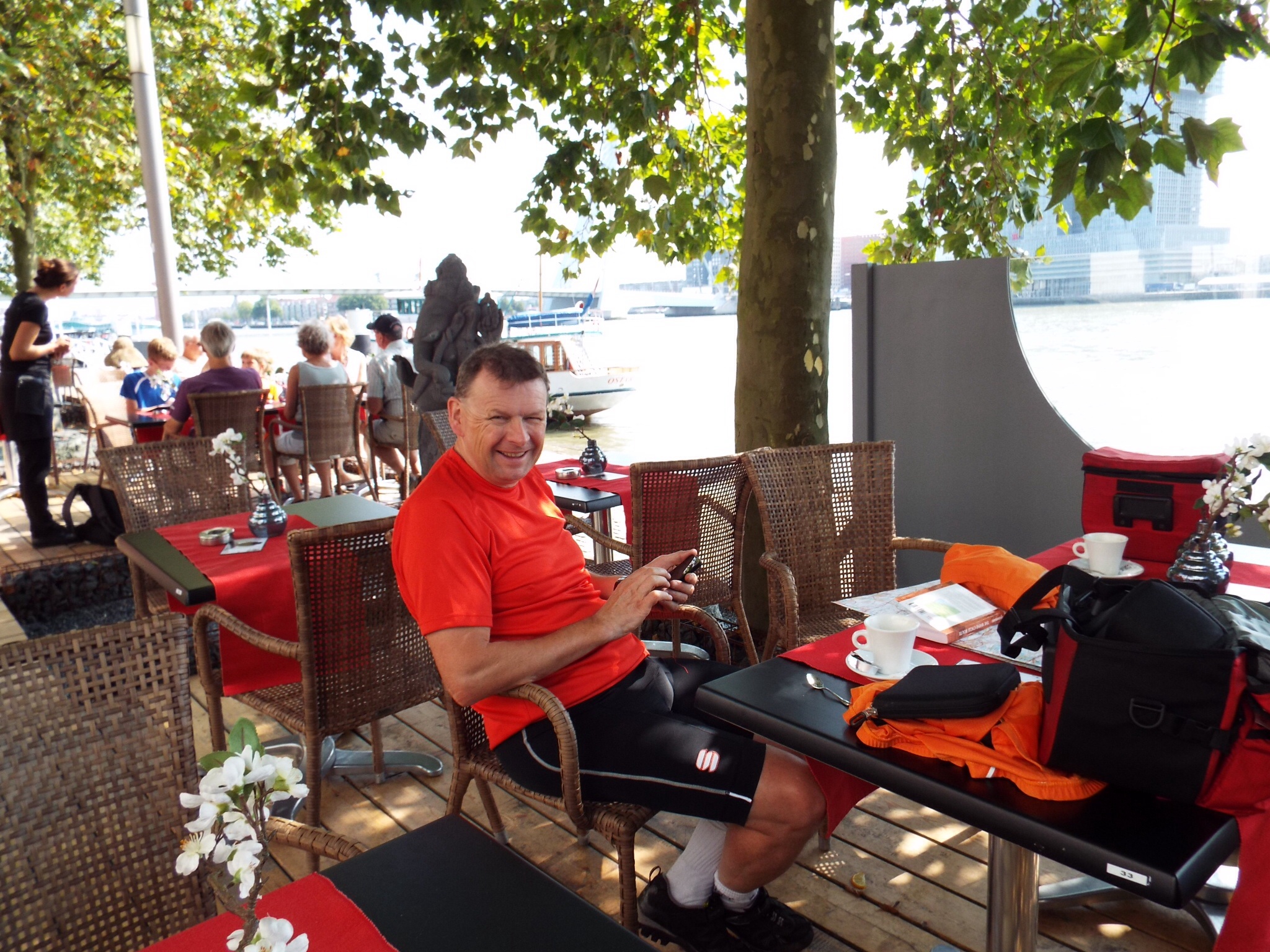 Flat is great when cycling, but only if there is no wind and unfortunately we had a stiff breeze against us. That combined with the early start and tired legs from our 80 miles yesterday made it feel as if we were cycling perpetually up hill. Towards Rotterdam the river curved away from the wind a bit and the route took us slightly away from the river bank so made the last bit easier – although replaced with the usual hassles of navigating through a large city. However, we safely made it into the centre of Rotterdam for late morning coffee overlooking the river again (now called the Nieuwe Maas) and the dramatic Erasmus Bridge.
