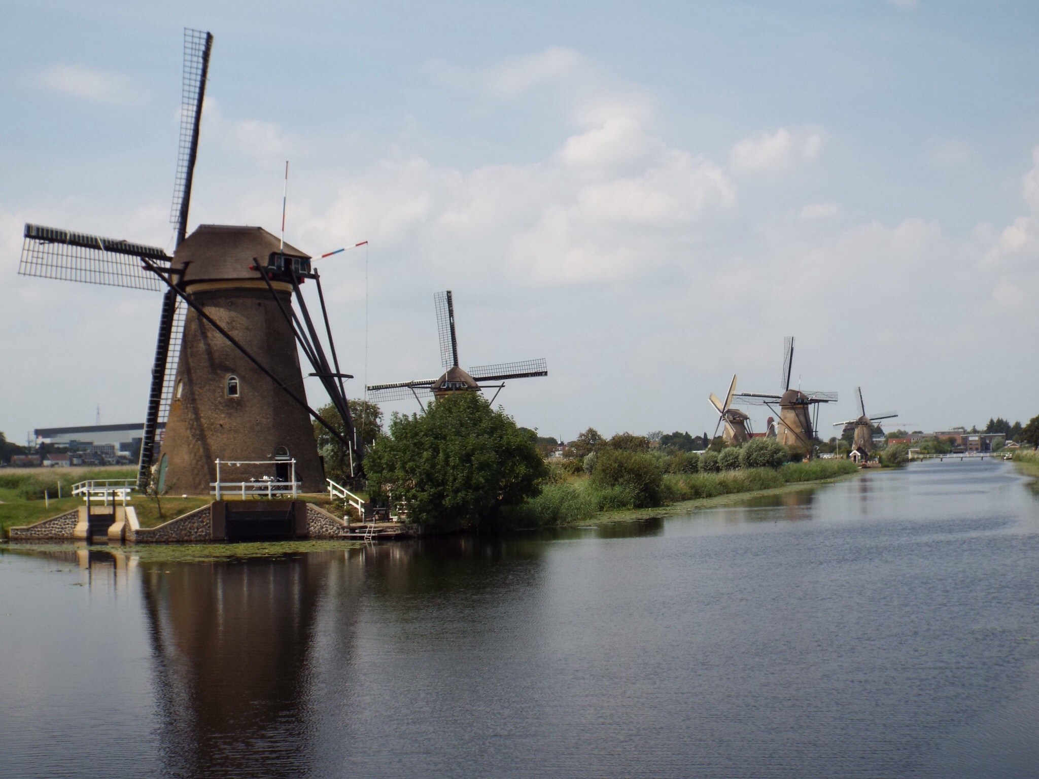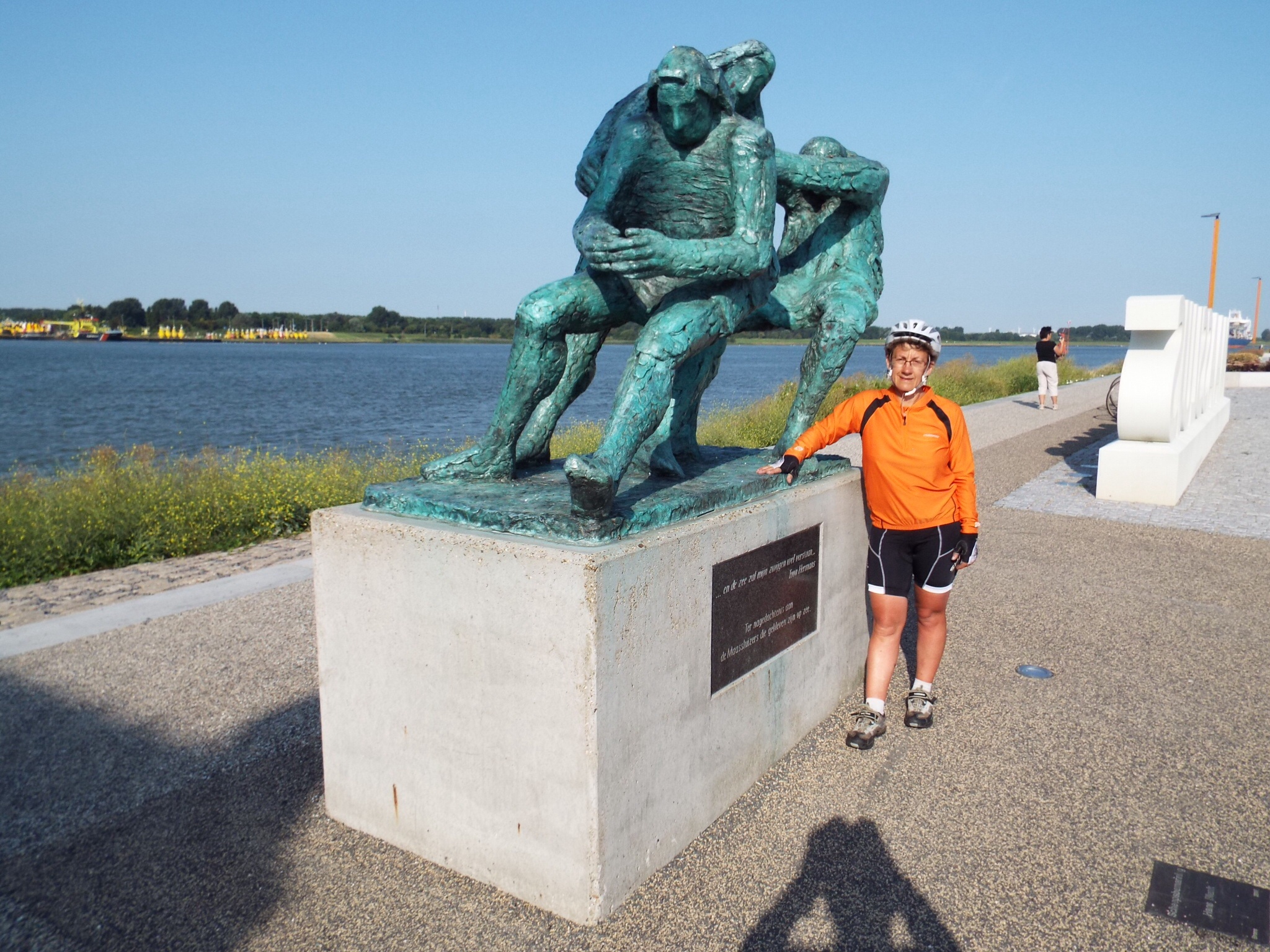 We were immediately in Kinderdjijk and one of Holland’s iconic sites. 19 windmills dating between 1738 and 1760 line the sides of 2 parallel canals. Built to pump water from the drained land between the Lek and the Nord, which like much of Holland lies below sea level. Some brick, some thatched and some stone, some restored to working order, they were a very picturesque site as we cycled the bike path between the 2 canals. The wind was now slightly behind and we scooted along at last eating up some kilometers. The bike path then led up to the dyke along the river Lek. We are on the Rhine route but as the Rhine reaches Holland it divides into several different channels to the sea. The Lek is the most direct extension and the one we will be following until we reach the Rhine proper.