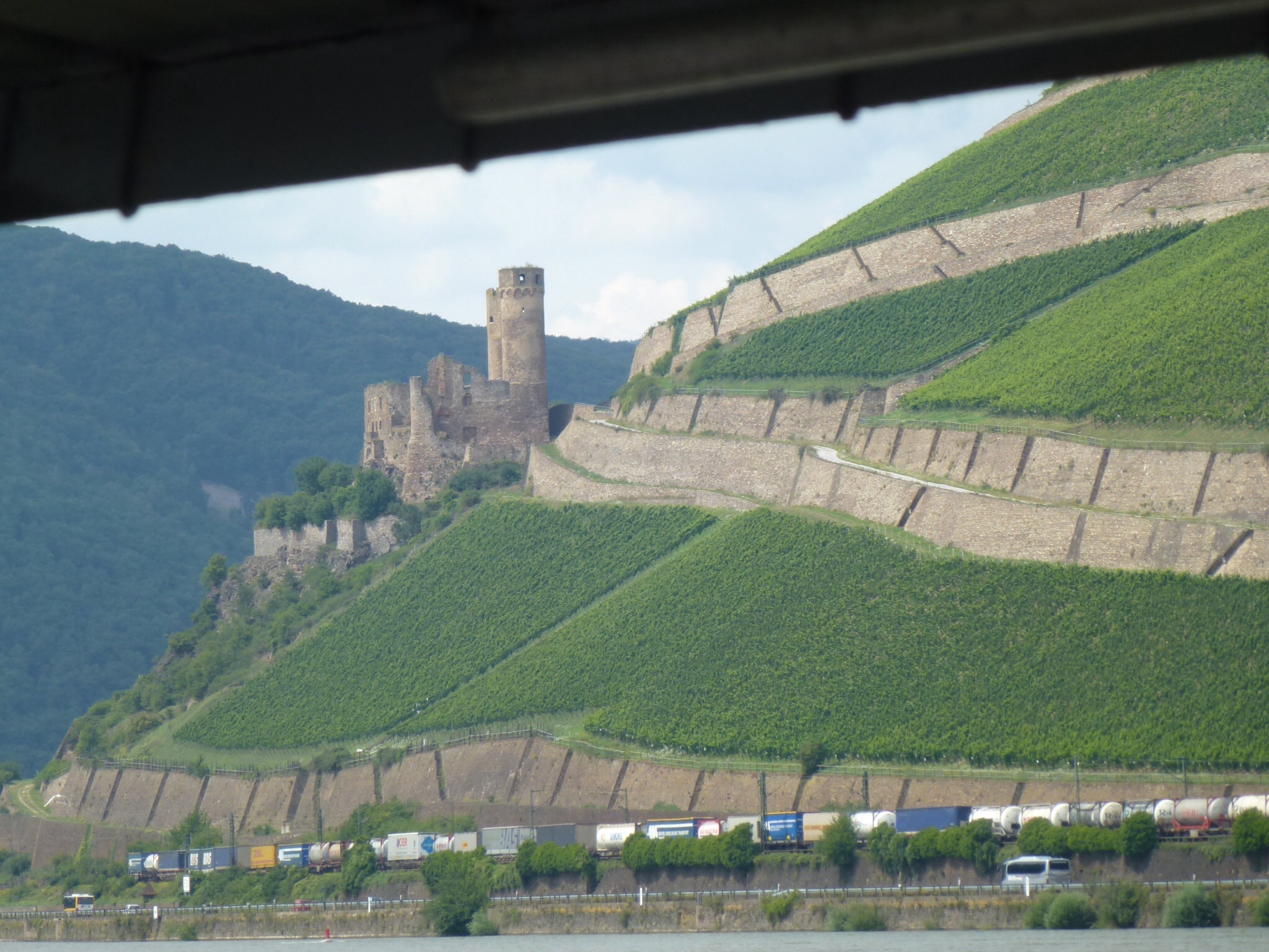 The early morning mist hung over the river for the first part of the morning but the sun graduallly came out. Our first stop was in the lovely town of Boppard where we had a lovely breakfast on the terrace of a little hotel. As we ate Tinika and Henry, the Dutch couple we had met a few days ago, cycled by. She was still in a cotton dress and he in his flapping coton shirt and sandals. I am sure they will make it to Crete eventually!