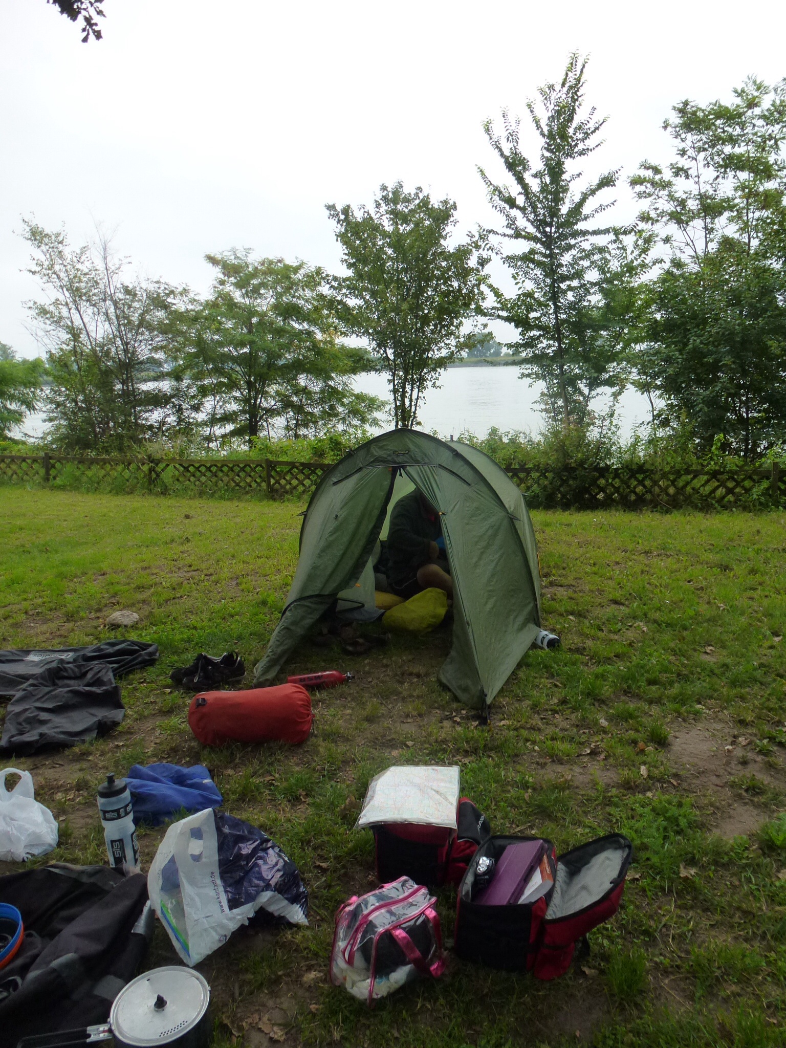 We woke, packed up and left only to find both tyres on the trailer on my bike were flat. We changed one and pumped up the other (which had a slow puncture and needs sorting later). Eventually we got going and then cycled away from the river through a wine growing area.