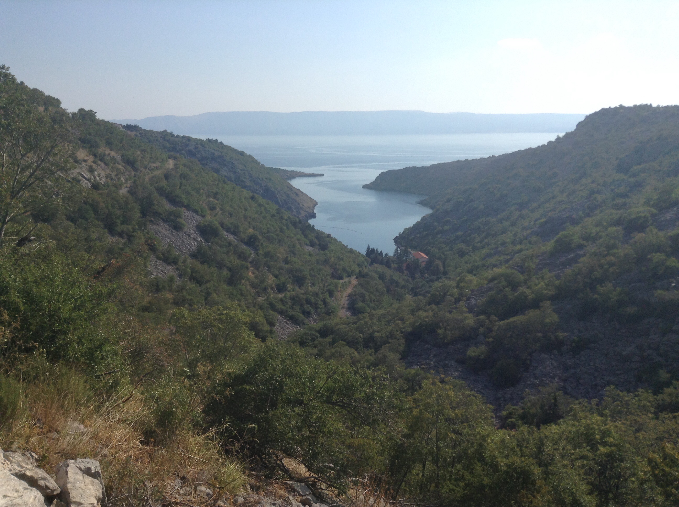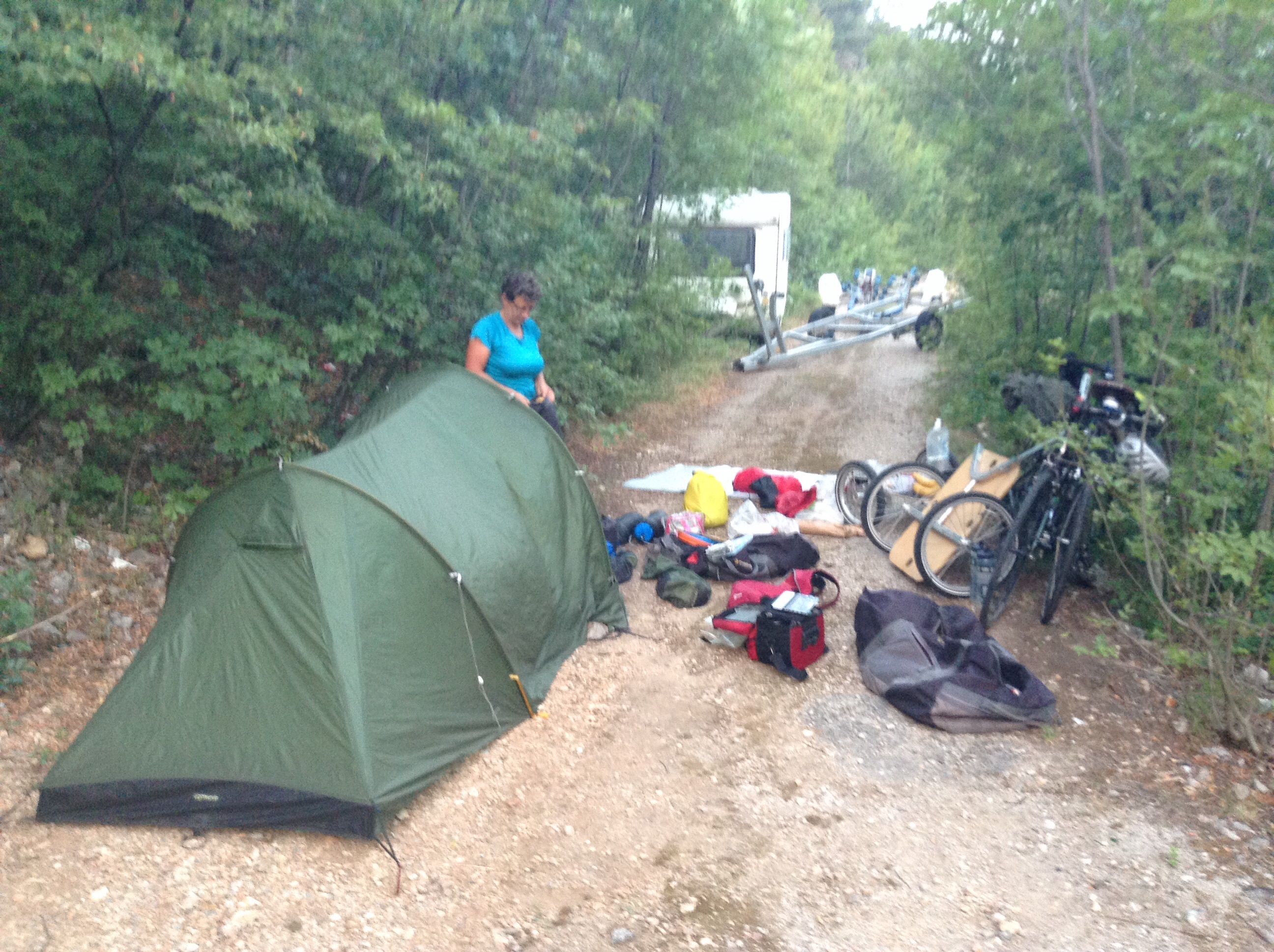 Our quiet secluded camping place at the far end of the campsite proved tranquil and we both had a good night. Up at 6.30 and away by 7.50 – the once known and ingrained routine started to become familiar again. image The coast road was remarkably busy at 8am, which I suppose is not surprising as people were on their way to work. Not everyone was on holiday (and many of those who were working were working in the tourist industry). Tourists are, after all, very demanding! We passed back through Lovran (home to the grumpiest person ever in the tourist information – would have deserved an audition for Fawlty Towers) and then to the idyllic town of Opatija. This is a place where the Austro-Hungarian empire has never died – a sort of Vienna by the seaside. Magnificent Hapsburg villas, some of which were glorious ruins but most were hotels. Lots of ancient Germans and Austrians with posh hotels, even posher shops, well made up ladies of a certain age and a high “tiny dog on a lead” factor. Best passed through at speed but not to be missed entirely. We were going North at this point around the coast, but hit the corner and then swung South East. This will be our direction for the next few thousand miles, give or take a few turns. Rijeka is Croatia’s third city, its largest port and also had a strong Viennese influence. It was busy, bustling and felt like a port – a full working port with cranes, railway lines and the accompanying feeling of depravity. There is something similar about ports the world over (like airports but more interesting and less uniform). Ports take up vast parts of the sea front, have derricks that dominate the skyline and generally define the feel of a city – and Rijeka was not that different. It was easy to get in but a 1.3km tunnel seemed the only way out – Which was pretty scary. But the road re-emerged and then climbed and dipped and climbed some more (just in case the previous climbing was not enough). Coastal roads are, of course, only very occasionally flat. They normally go up and down at regular intervals, and are as steep as any mountain pass. The difference is that the hills top out at about 150m , the road goes down and then the climbing begins again. image image We saw some great scenery but just south of Kratjevica the motorway stopped and so all the traffic joined the single track road. Add to that a temperature of 39 degrees and we were well ready for a break at the pleasant coastal town of Crikvenica. I got my hair cut shorter than it has been for years and we vegetated until the worst of the heat of the day eased off. We tried to Skpe the children but the internet was rubbish (and this evening they have “a few technical problems” and so there is no internet here either). Then we pm were back on the bikes at 3.45and noted that the worst of the day’s heat was easing off. It was still 38 oC but felt much better than 1am! The road was also quieter and we ambled up and down the hills of the coast road. Scenery was stunning; more arid than 50km further north and much less populated. There were stunning little coves that always seemed to have a few people swimming and lazing about. All of the population lives within a few yards of the sea because inland is scrubby hills which cannot support any agriculture. We pressed on and got to our destination, Senj about 5.30pm, but the single campsite was crowded and had a sole spare pitch – cheek by jowl with large camper vans and stony ground. It was not too inviting. We saw another campsite a few km further on so we shopped for food and then got back on the bikes. Finally, having hit 1000m of climbing for the first time on this part of the trip we arrived in paradise. Problem was that others had found it first and they were full! A little negotiation and a little pathetic pleading saw us camping at the side of the car park (soft, quiet and ideal for a quick get away as well as cut price). Within 45 minutes we had the tent up, campsite sorted and were in the sea swimming away aching limbs. image image We do not, of course, need to put our bodies through excesses in order to appreciate the good things in life – like swimming in the Adriatic as the sun is coming down. But for us – it helps. The view is always better if we have sweated the way to the top. The sea water is warmer and more relaxing after a day in the saddle. Food tastes better if I have earned the hunger. It’s a personal view which many find unintelligible and I totally respect people’s ability to see the world in a multitude of different ways. But sitting in the tiny bar with a beer this evening, life looks pretty good.