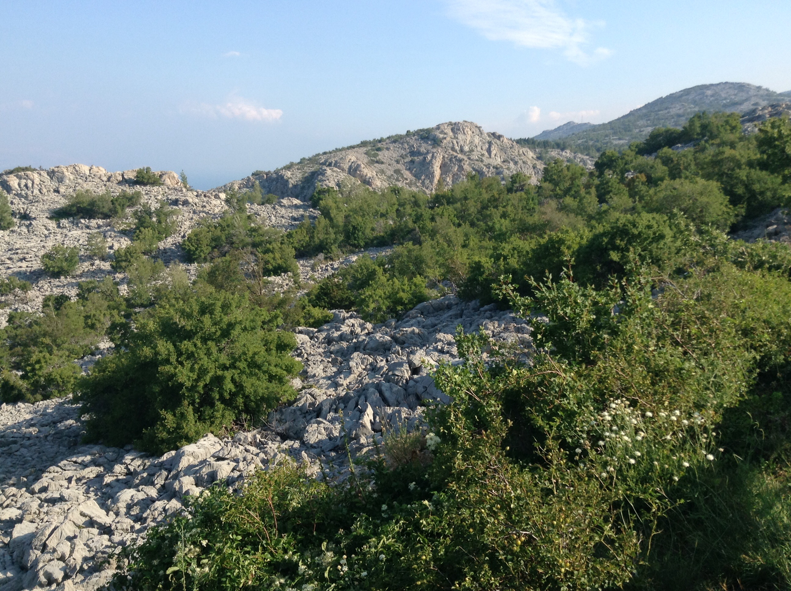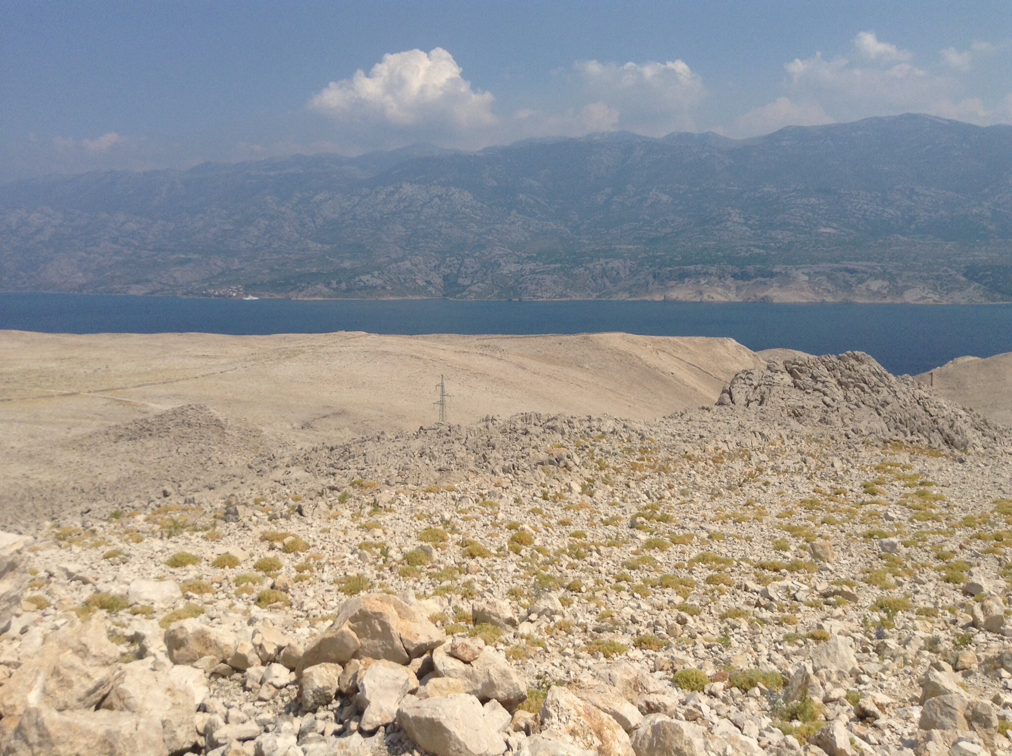 Replenished for a few more ups and downs then more down than up followed by a steep road down away from the main road (which had been reasonably quiet of traffic) to catch the ferry to Pag Island. We took some pleasure in zooming past the lines of cars queuing for the ferry (ignoble I know) to hit the front of the queue just as the ferry arrived. The 15 minute ferry ride was just long enough to cool down in the air conditioned cafe on the boat before turning out into the furnace!