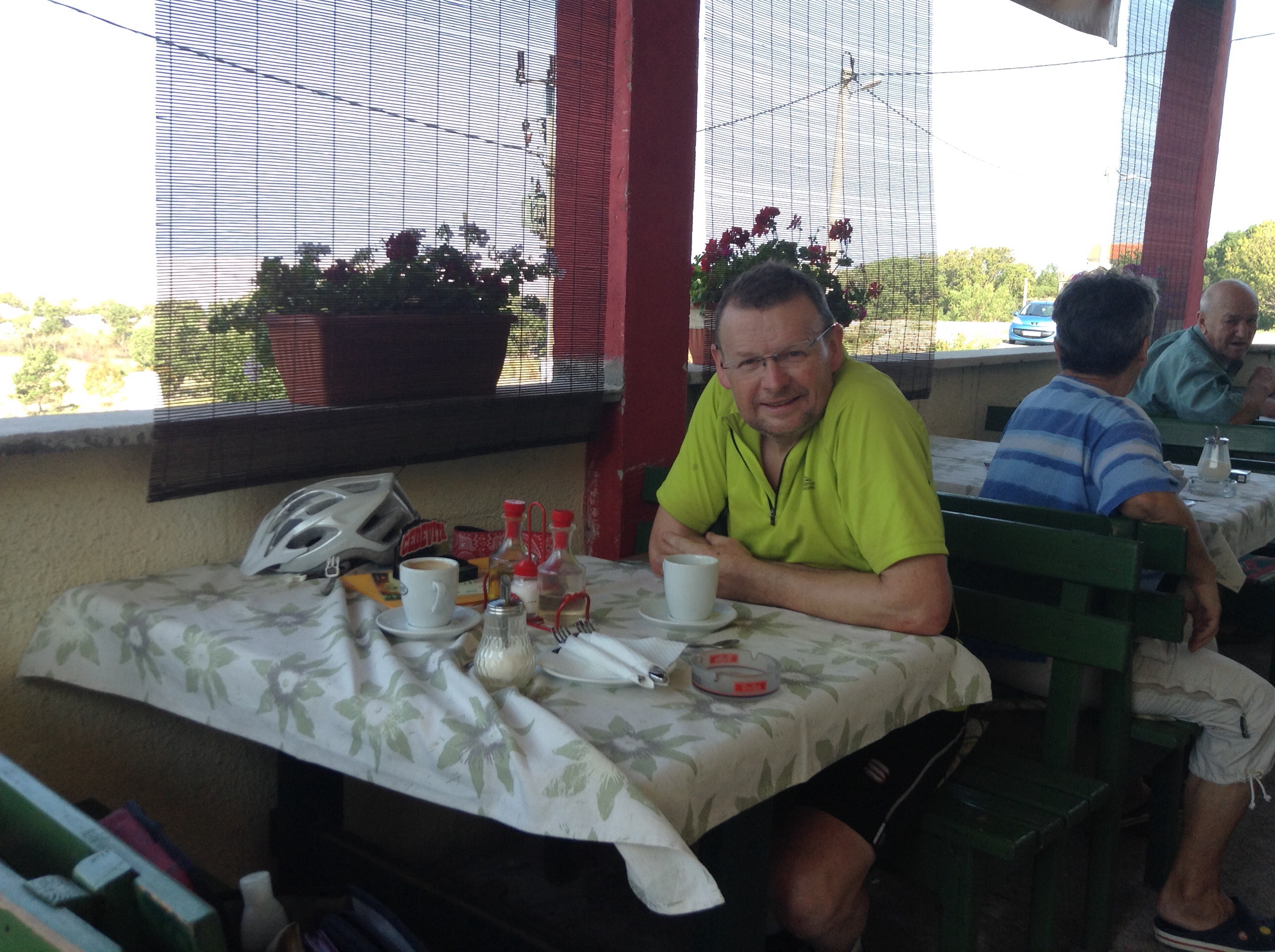 Just as we were craving a coffee stop a little cafe appeared in a tiny village. It was a perfect stop – second breakfast (my favorite meal) of omlettes and coffee and assorted locals jabbering away. At one point a Slovenian couple arrived on a smart motorbike – all leathers and baltic power dressing! He smoked and she ate omelette. The characture of the slav hard man is, of course, just that – a stereotype of the baltic fighting man. But there are plenty of men living this character, with a perpetual cigarette hanging out and a pretty girl on their arms.