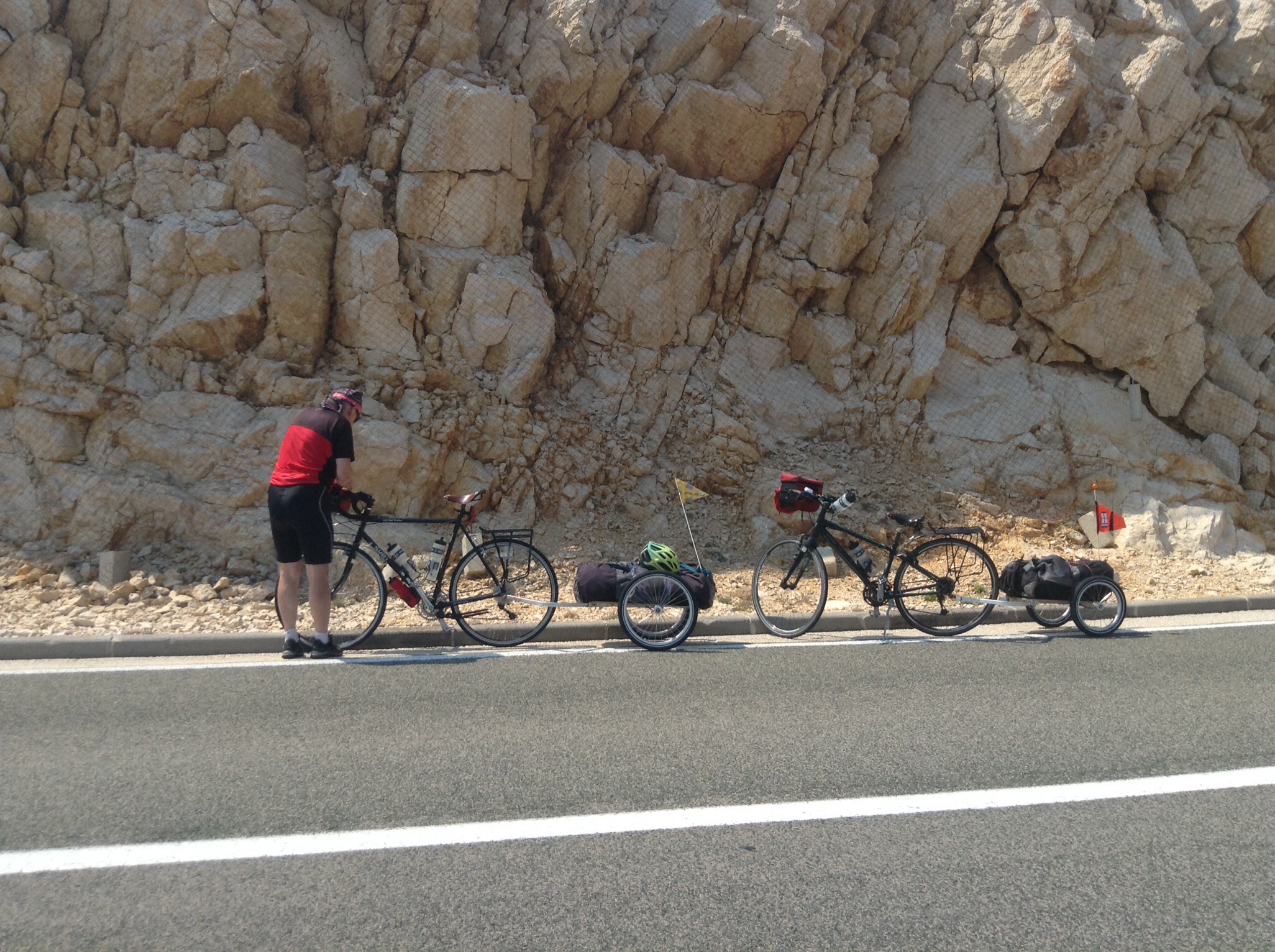 We were now cycling in near-lunatic mode. It was 41+ degrees and we should have been out of the sun but we just wanted to get to Pag Town so we could finish up the day. The map showed a little road along the coast that was half the distance than the main road and avoided some steep hills. It was – in OS terms – a “white road”. The reason it was only marked as a white road on the map, as it turned out, was because it was mainly a dirt track. Good for mountain bikes (and we saw some) but a tad tougher for road bikes with trailers.