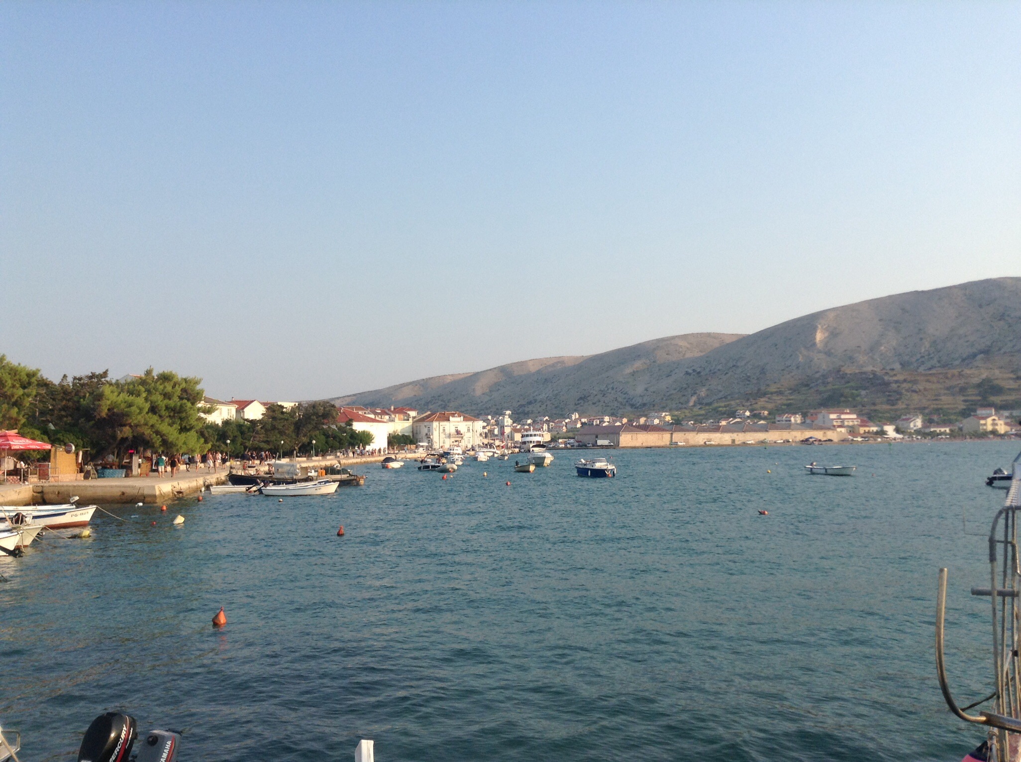 Almost midday now and this side of the island is described in the guidebook as a ‘moonscape’ and a very accurate description it was too. Of course there had to be a climb out of the ferry port (just a small shed) to the ridge of the island. Mad dogs and Englishmen…….say no more…but the heat was tempered somewhat by a breeze. Having reached the main road that runs north/south along the long length of the island we had a choice turn right to Novalia, described as the party beach of Croatia, and only a few kms away or turn left to Pag town. Again guided by the guide book that said depending on whether your age was under or over 35 you would love or hate Novalia so attracted though we were to clubbing all night (!) our early start turned our wheels towards Pag. We later learned that Ant had travelled all the way from Belgrade on an overnight train to party on the beach at Novalia – and said it was very good and he got home at 7.30am!