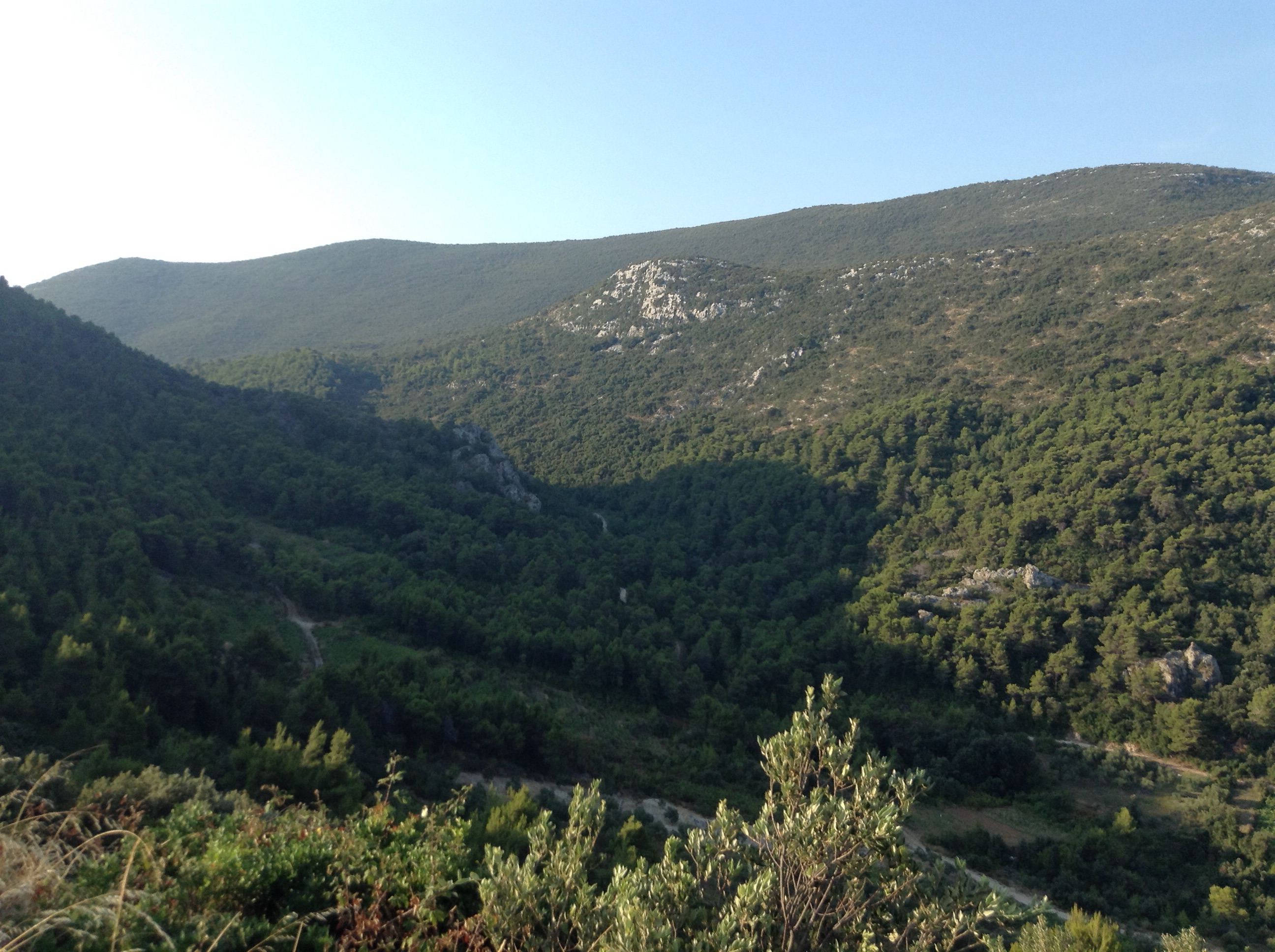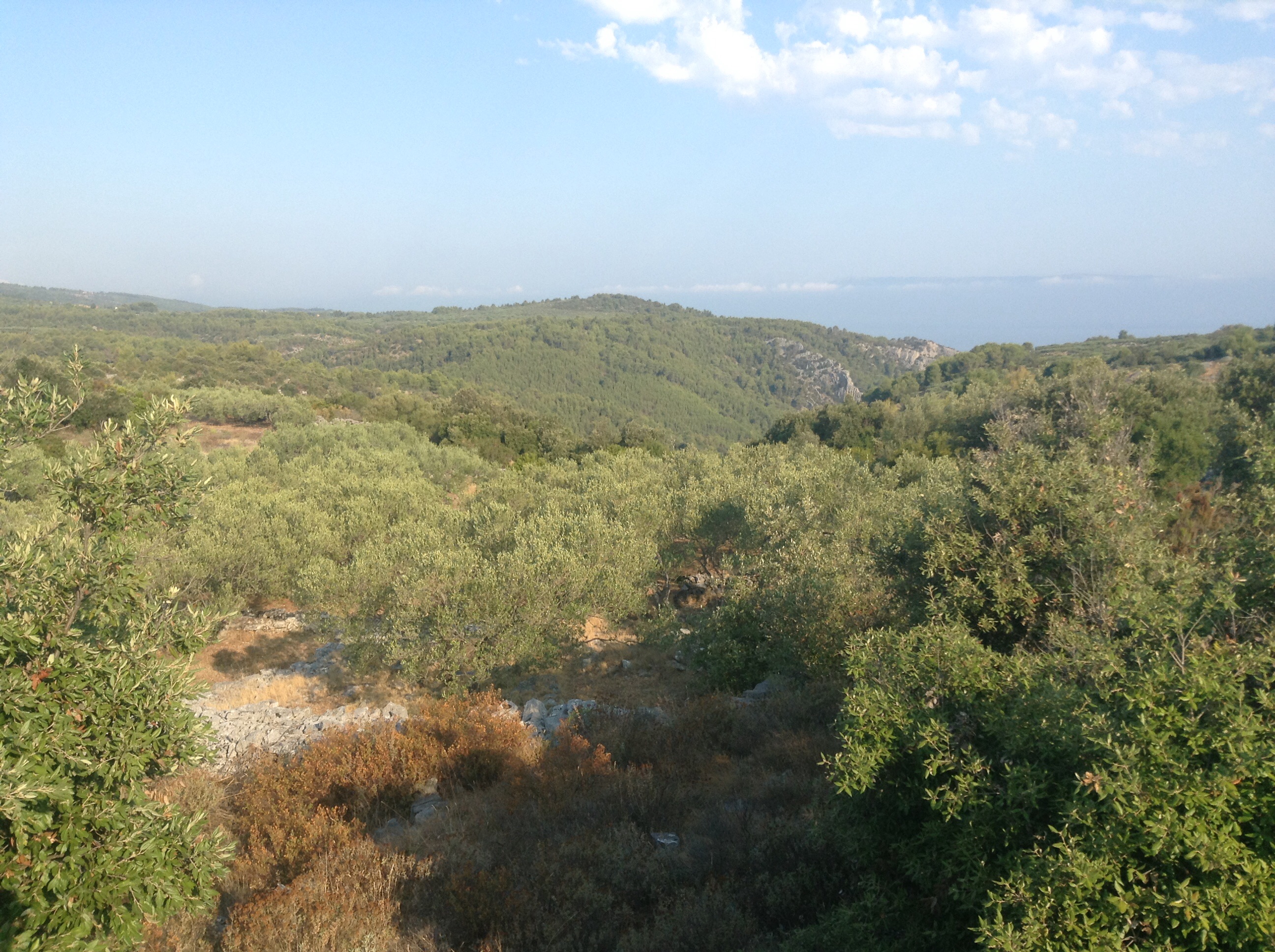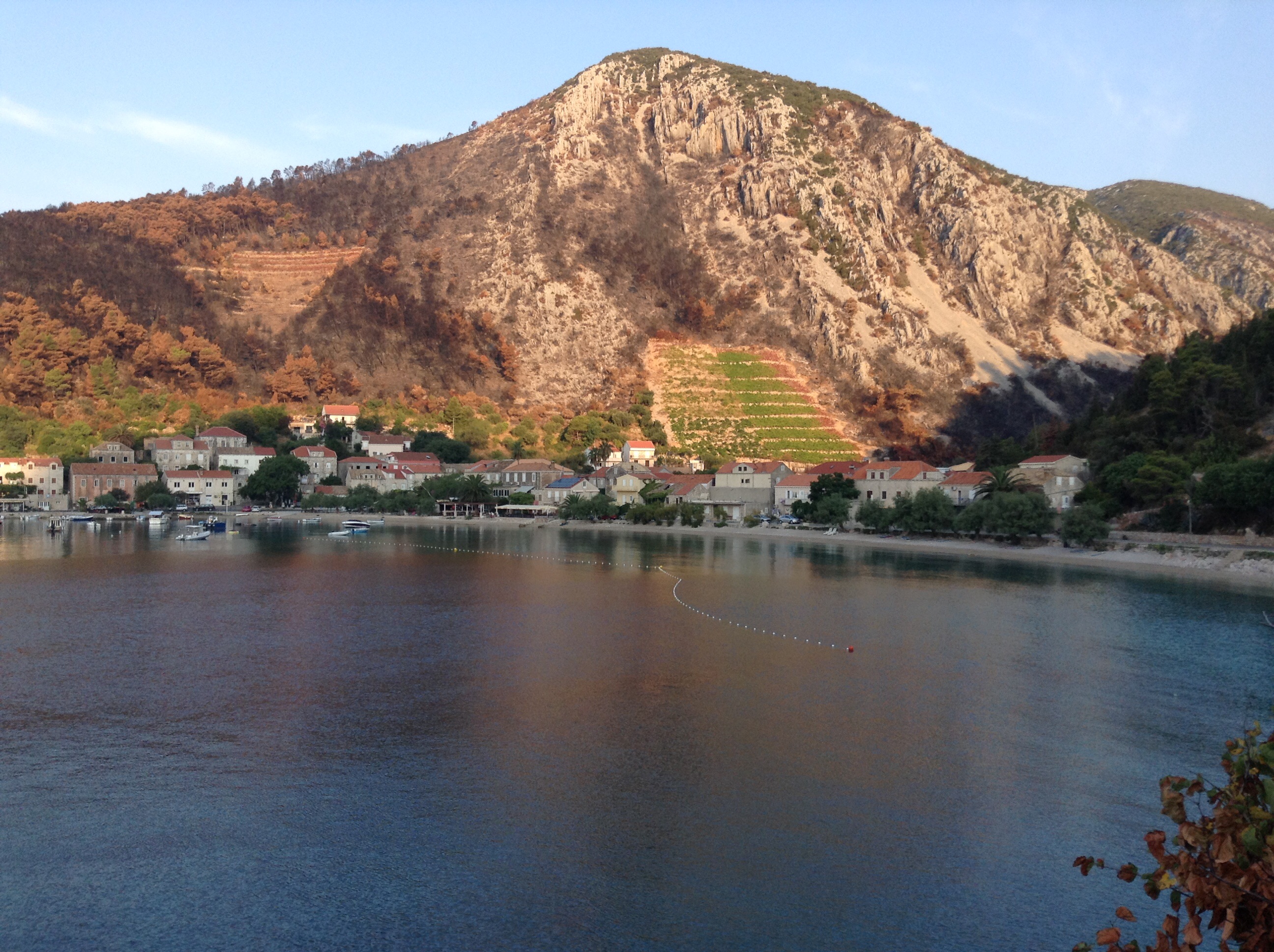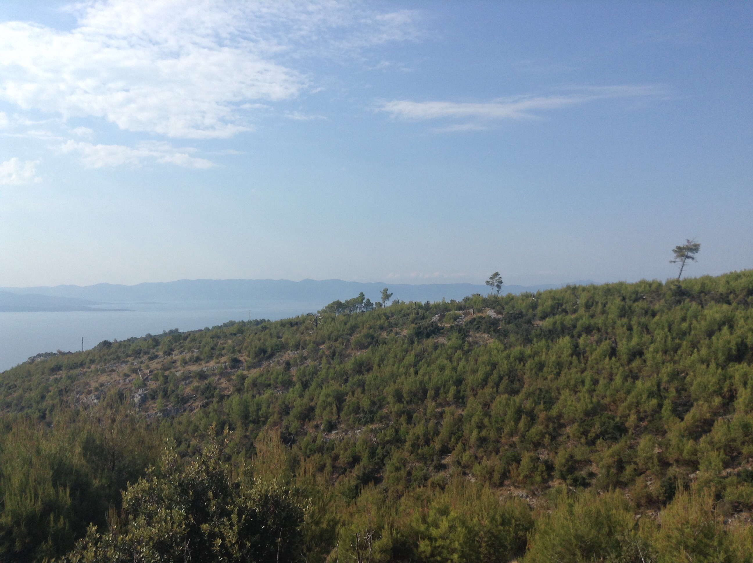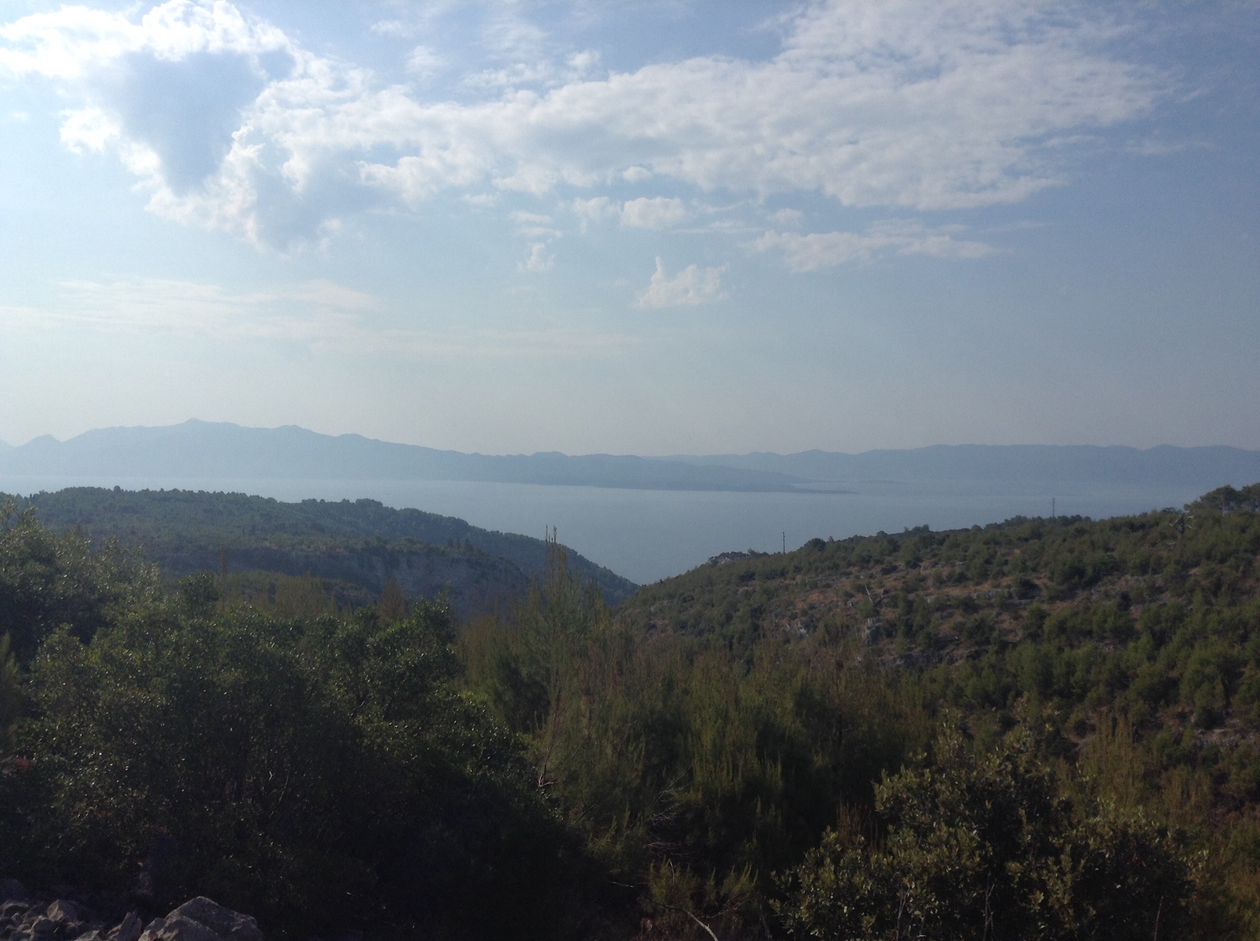 As a result we were a bit late starting but left the newly made friends (still asleep mostly) just before 7. The route took us Eastwards long the island of Hvar. For those unfamiliar with this part of the Adriatic, these islands are almost all extinct volcanos with massive mountainous spines rising out of the sea like the back of some massive teradactyl. They are quite green with cultivated parts, and now specialise in viniculture. The road snaked its way from the shore to the ridge of the island, never more than about 7% gradient but constantly up. It topped out at about 300m and then undulated along the spine of the island offering magnificent views to the mainland to the north and to Korcula Island and the Peljesac peninsular to the south.