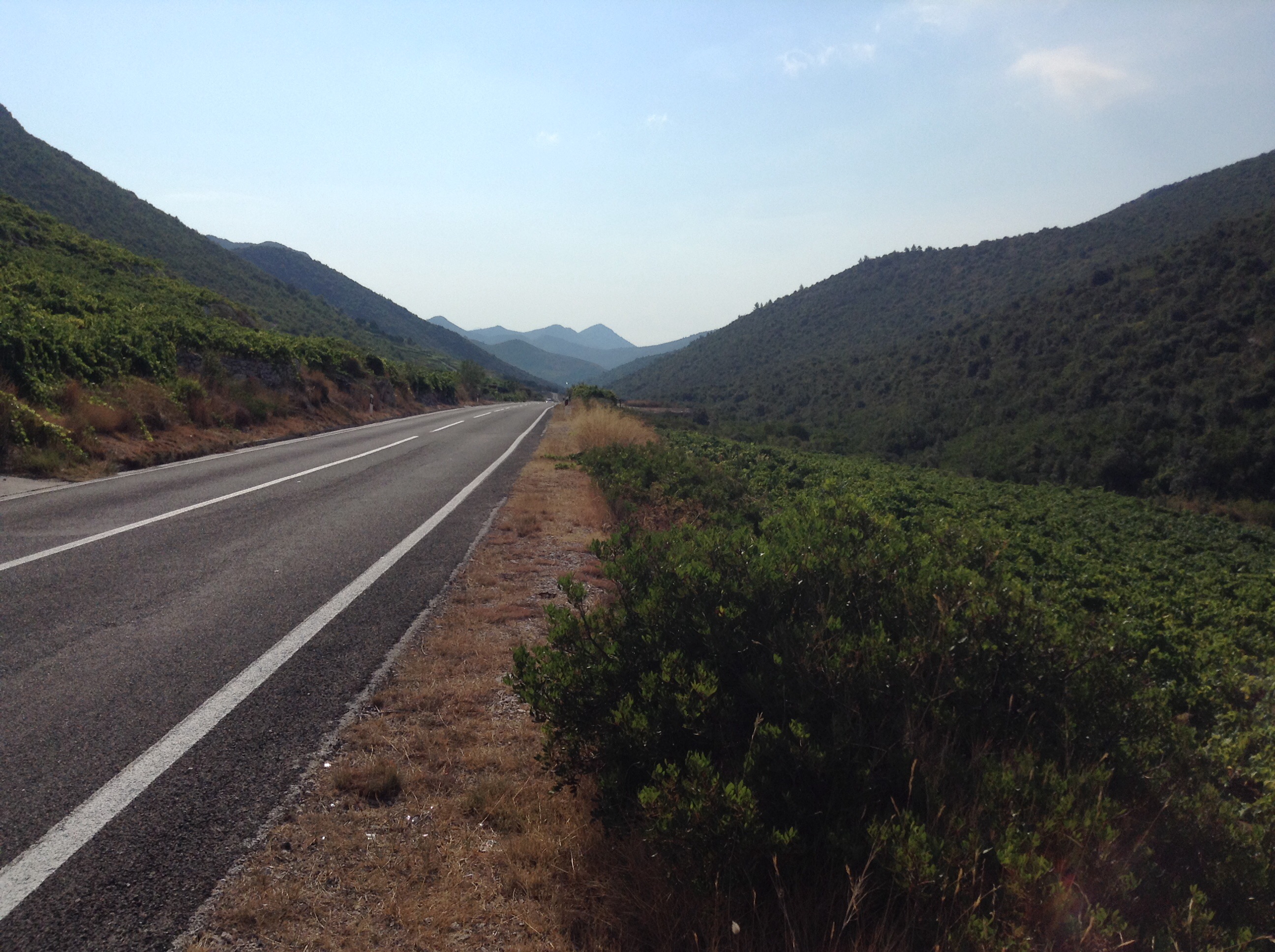 The village one of so many vying got ‘prettiest place in Croatia’ then the inevitable turn up the hill. Our legs still strong in spite of the climbing the previous day we reached the centre ridge of the peninsular. At the top David had a problem with his gear shifter that had become loose. He carefully dismantled it all and got it back together working again while I did helpful things like hold out my hand to take tiny bits of metal. We were soon on our way again cycling through vineyards in the early sun. At the neck of the peninsular the little town of Ston was an important salt producing settlement and was heavily fortified with amazing stone walls and towers climbing up the steep hill.