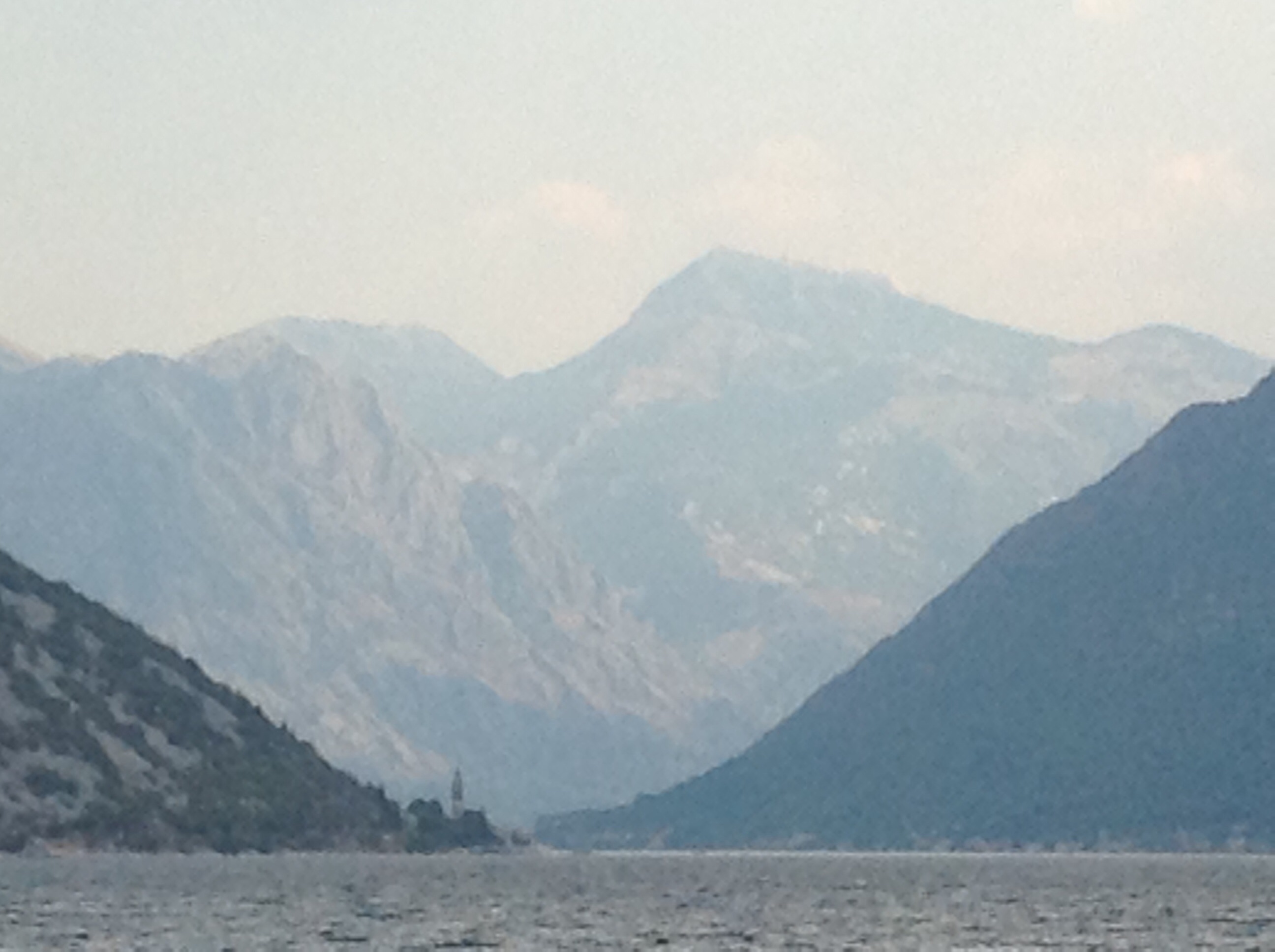 At the neck between the inner and outer bay there is a 5 minute ferry that crosses to take you directly to Kotor – but that way we would miss what is described as a jewel of Montenegro so we decided to cycle the 30km or so round the inner bay. It was amazing scenery. The inner bay is surrounded by high rocky mountains. It clouded up giving a rather dark and broody feel to it – very atmospheric. It was also hot and sticky and my legs were feeling very drained from the earlier climbs so was grateful that it was also mostly flat. We stopped for a swim and picnic then continued through pretty towns to the main town on the bay, Kotor. Anchored outside was an enormous liner and several other very posh looking boats of various sizes. Somewhere going round the bay of Kotor we clocked up 1,000 km on this leg of the journey but did not mark it due to incompetence.