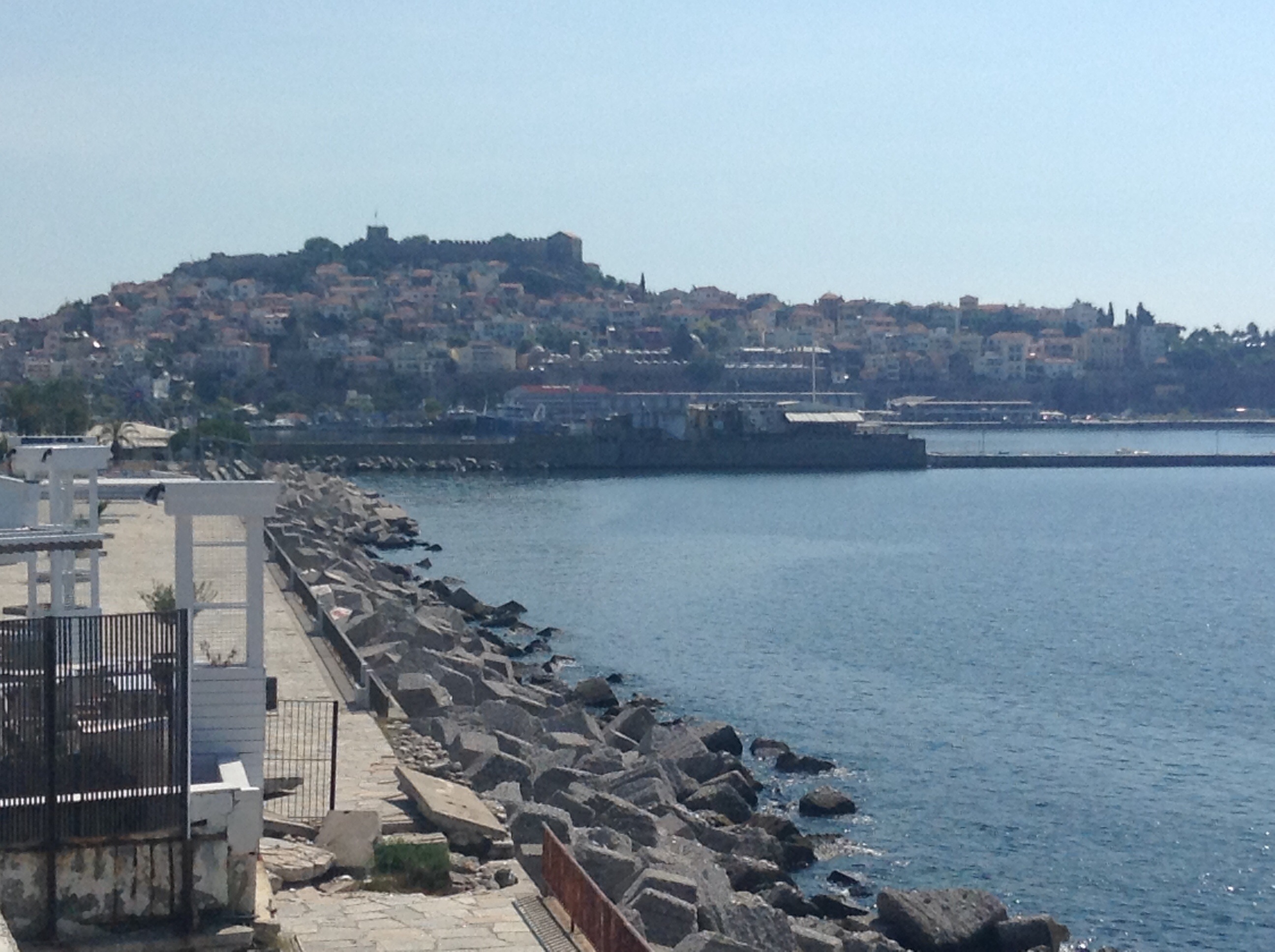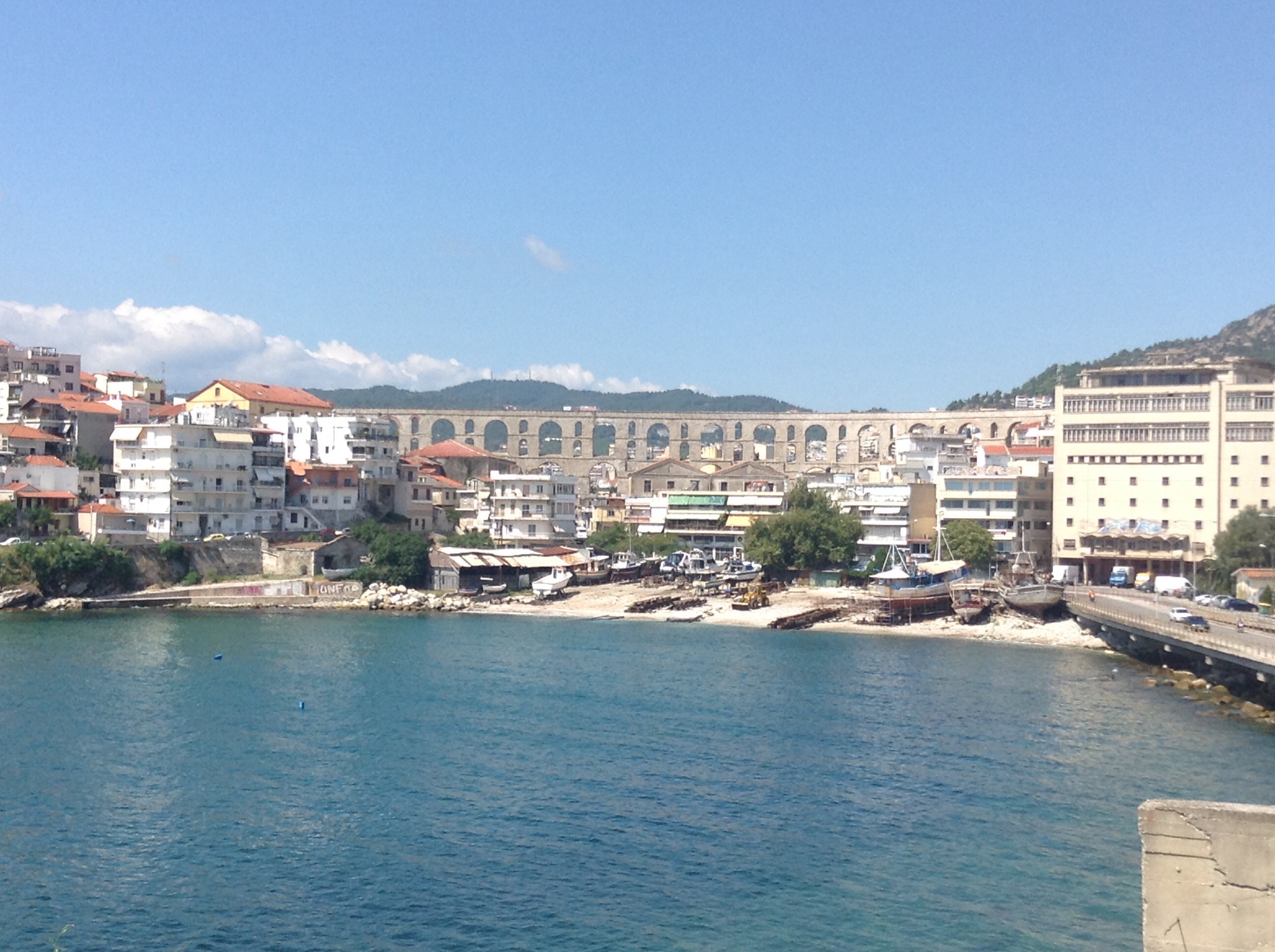 Kavala is the second city of Macedonia. Mostly modern with sparkling white buildings on the hillsides. We trundled into the centre where a small castle sits on a mound above the port with the remaining parts of the old town below it but most dramatically an enormous aquaduct spans the main road. Modelled on roman aqueducts it was ‘only’ built in about 1530. It was still bringing water to the city until the early 20th century. Pretty restaurants lined the harbour area and we were empty and looking forward to lunch – unfortunately we had made good time and it was only 11.30 and none of the restaurants were open! So we snacked on fruit and crisps and stopped 10 miles later at Neo Kavala, a sleepy little village with a shady restaurant by the sea shore, and ate kebabs and Greek salad (of course).