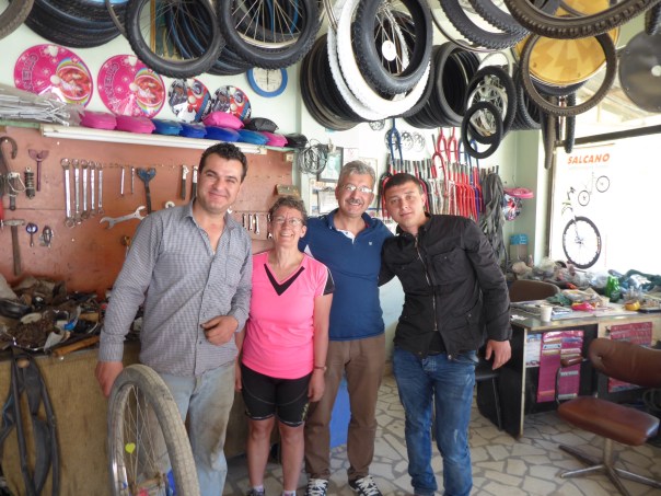 The mission in Yenisehir was to find a bike shop and get Bernie’s saddle fixed after the damage caused in transit. My string repair at the airport would only last so long. We paused to wonder which way to go and immediately asked by a friendly young man, Samet, if he could help and he guided us to a bike shop. The wonders of googetranslate! The repair took an hour or so – and we had tea whilst they fashioned the piece from scratch that was missing. Ultimate ingenuity – “Turkish” said the repair man proudly at the end clearly proud of both his work and his country. It cost TL10 – about £2.50 for that brilliant job – and some smiling photos.