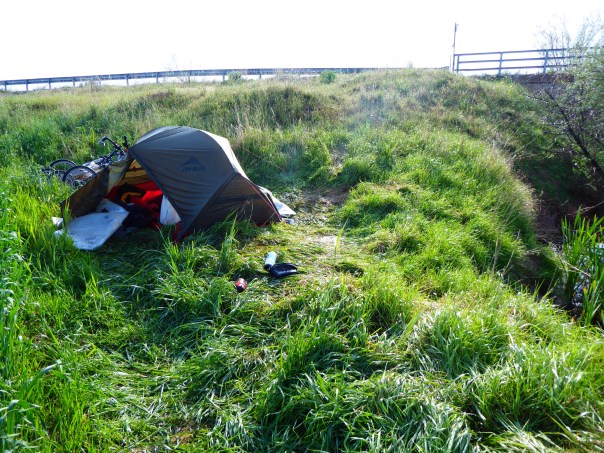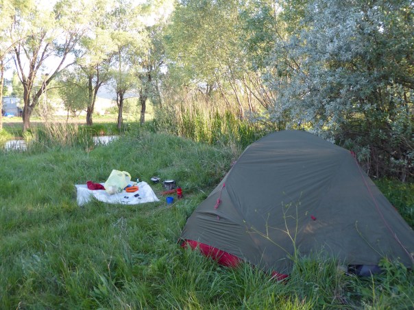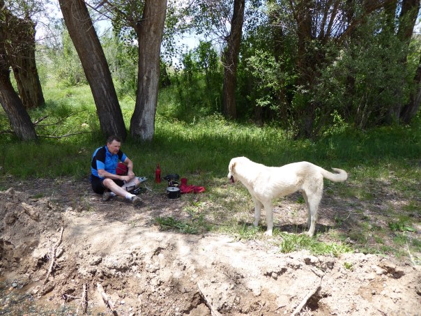 The last few km seemed to take an age. We reached the turn up to the town and cogitated turning up to the town to see if there was a hotel as we were so knackered or whether to go straight on to see if we could find a camping spot. I flagged down a car to ask if there was a hotel, not wanting to do any more climbing unless necessary but got a negative and completely blank looks when asked if there was anywhere to camp. It looked as if we would have to press on…and it was up hill again. I tried to stop my moral sinking but just as we set off I glanced to a track and could see it ran down to a stream with some (rare) flat land. We wheeled our bikes down and at the end of the track there was a group of men, women and children. We asked if we could camp there and of course the response was “no problem, have some tea”. A fire was already brewing the teapot. It looked like three families, one of whom must have owned the little shack that was there.