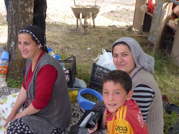 The last few km seemed to take an age. We reached the turn up to the town and cogitated turning up to the town to see if there was a hotel as we were so knackered or whether to go straight on to see if we could find a camping spot. I flagged down a car to ask if there was a hotel, not wanting to do any more climbing unless necessary but got a negative and completely blank looks when asked if there was anywhere to camp. It looked as if we would have to press on…and it was up hill again. I tried to stop my moral sinking but just as we set off I glanced to a track and could see it ran down to a stream with some (rare) flat land. We wheeled our bikes down and at the end of the track there was a group of men, women and children. We asked if we could camp there and of course the response was “no problem, have some tea”. A fire was already brewing the teapot. It looked like three families, one of whom must have owned the little shack that was there.