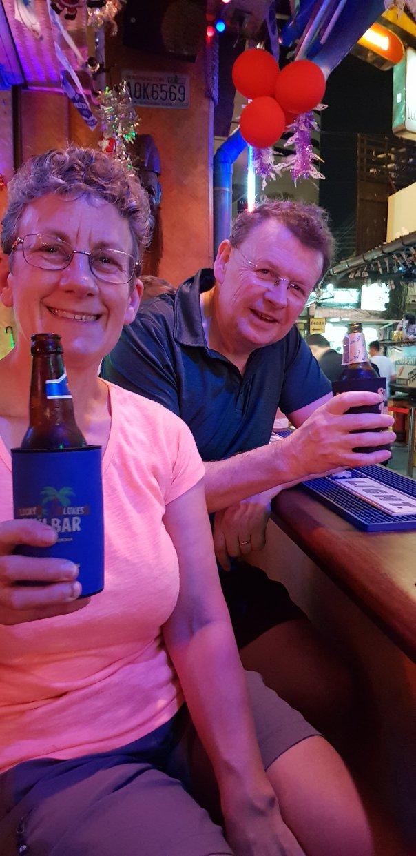 A 5 minute stroll took us into a classic tourist street . Bars liberally scattered with Thai women in tight dresses and an over abundance of middle aged white men…although plenty of couples too. We managed to avoid both the Ladyboy Bar and another bar called Spankers – no subtlety here. We watched the passing crowds as we sipped a beer in a garish orangy-pinky light. All a bit bizarre and not our natural milleur and would be depressing if spent too long there; but a taste of being another world and ready for what the next couple of months will bring before the final bliss of being horizontal.