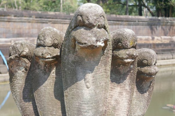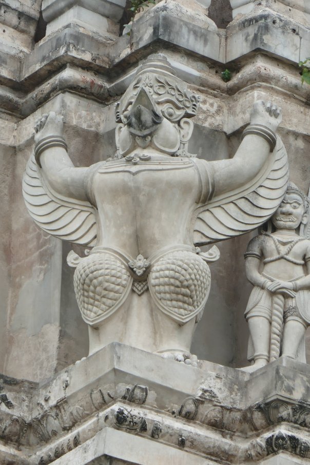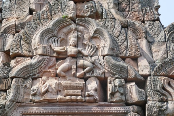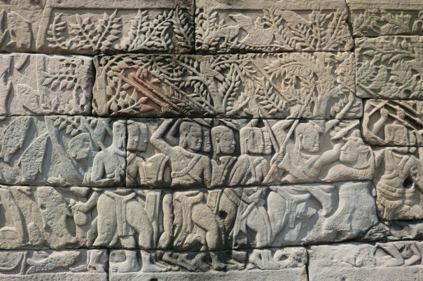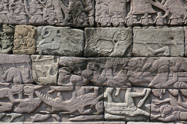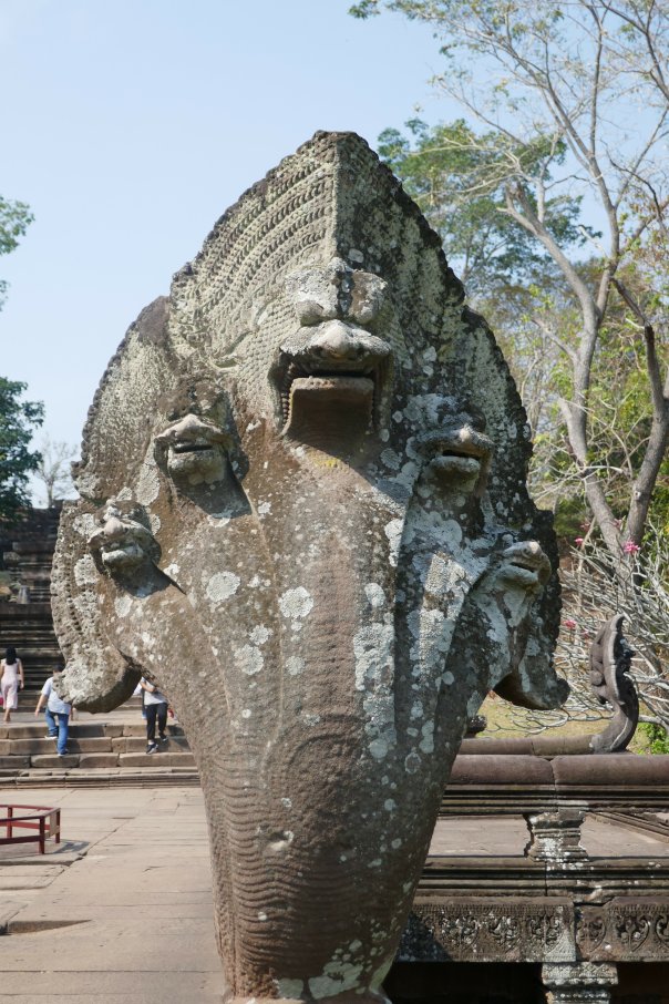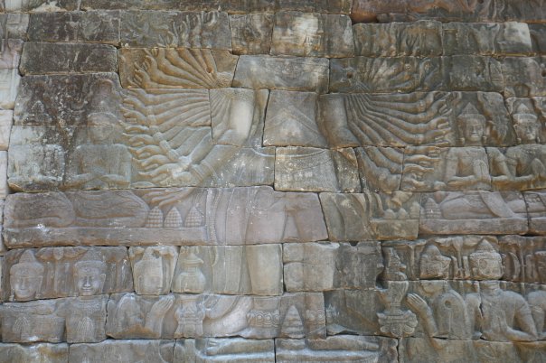 Many headed serpents, dancing girls, lotus flowers were all motives we had seen before. We made out way up the 3 levels of the towers and up the steep stairs to the inner sanctum of the middle tower. Only limited numbers are allowed in at a time so it was peaceful with great views. Then looking around magnificent Bas Reliefs in the outer walls chronicling wars, battles, ‘The Churning of the Ocean of Milk’ and the 37 heavens and 32 hells of Hindu mythology, among other things.