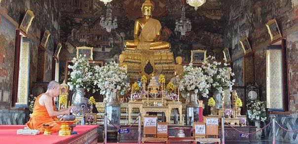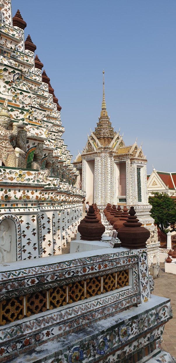 It is on the Thonburi west bank of the Chao Phraya River. The temple derives its name from the Hindu god Aruna, often personified as the radiations of the rising sun which is a delightful mixing of religions. Even when we went, well after dawn, the light reflects off the surface of the temple with pearly iridescence. Although the temple had existed since at least the seventeenth century, its distinctive prang (spires) were built in the early nineteenth century during the reign of King Rama II. There is an extensive complex of temples with monks in attendance adjacent to the formal temple, and we sat and watched as a devout couple made offerings and then received chanted blessings and sprays of holy water in exchange. Every religion has its rituals, and they usually involve the devoted giving money to the professionals. It was both charming and familiar as an exchange.