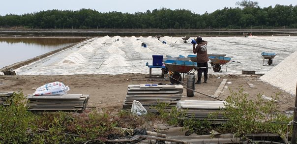 It was worth it as it was a relief to get onto a quiet side road-but bizarrely it seemed even hotter. The landscape was flat and featureless and what I initially took to be paddy fields were in fact salt flats.
