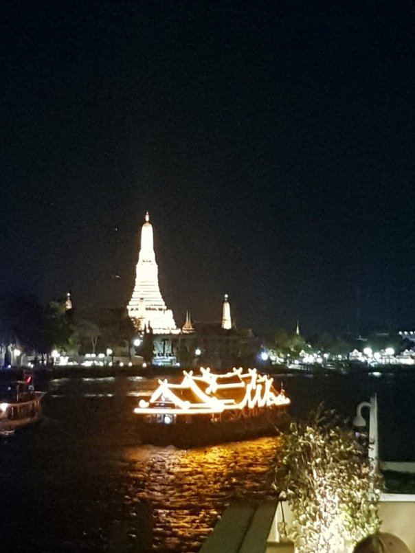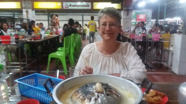 Dinner was at a tiny restaurant on the banks of the river in an old wooden house with wooden shutters opening directly onto the river. Bernie had the local speciality – sweet palm curry – a bit like a Korma but with much more punch (she ordered medium spice but suspect it was a ‘very mild’ for a Thai person). We met a solo traveller from Ruislip who was celebrating an early retirement package. What better way to do so.