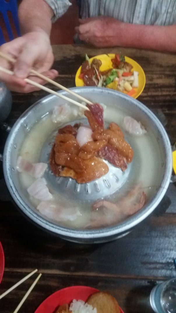 They plonked a bucket of steaming coals on our table and then put a contraption on top which had a moat for creating your own Pho (vegetable or fish soup) and for cooking meat freshly on top. All the ingredients were available and customers cooked their own meals – going back as often as you wanted for more.