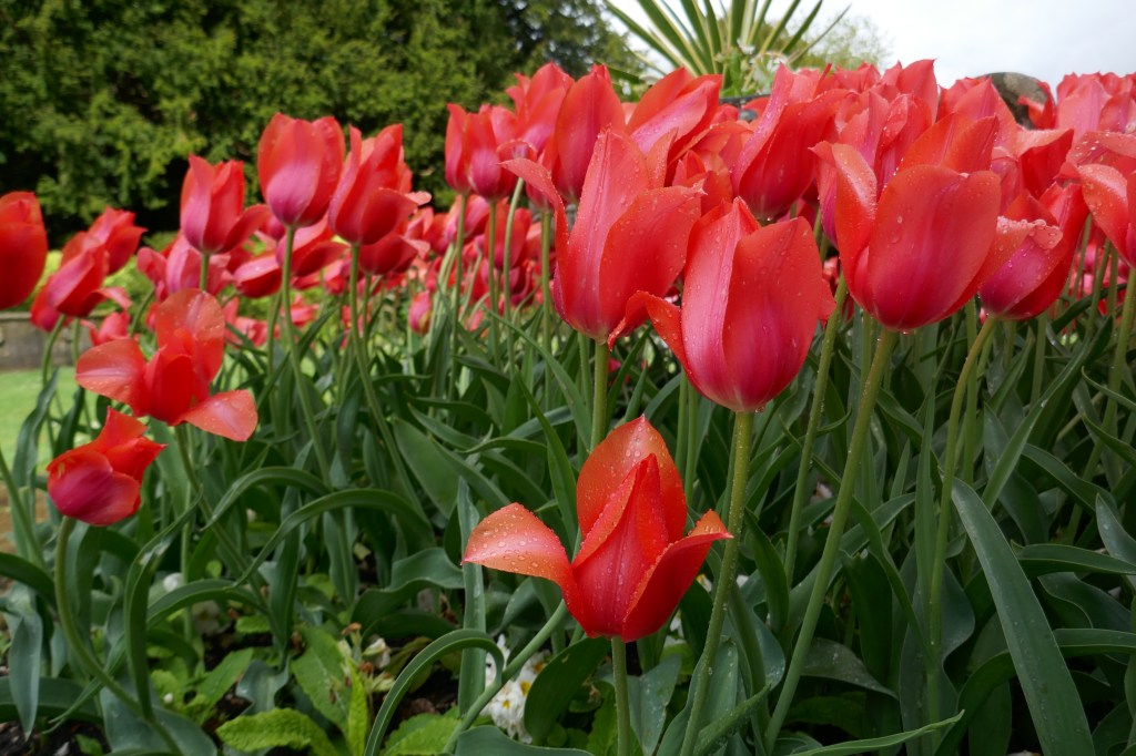 The overwhelming memory of the day was of colour. All the trees were in new leaf and an incredible array of greens. There were bluebells, vivid yellow fields of Rape, the white ‘candles’ of horse chesnuts and reds and maroons of magnificent copper beaches. Here, pink and red of arrays of tulips. Clouds of the whole pallet of greys broken by bright blue skies. All twinkling and glittering from the recent rain. All stunningly beautiful.