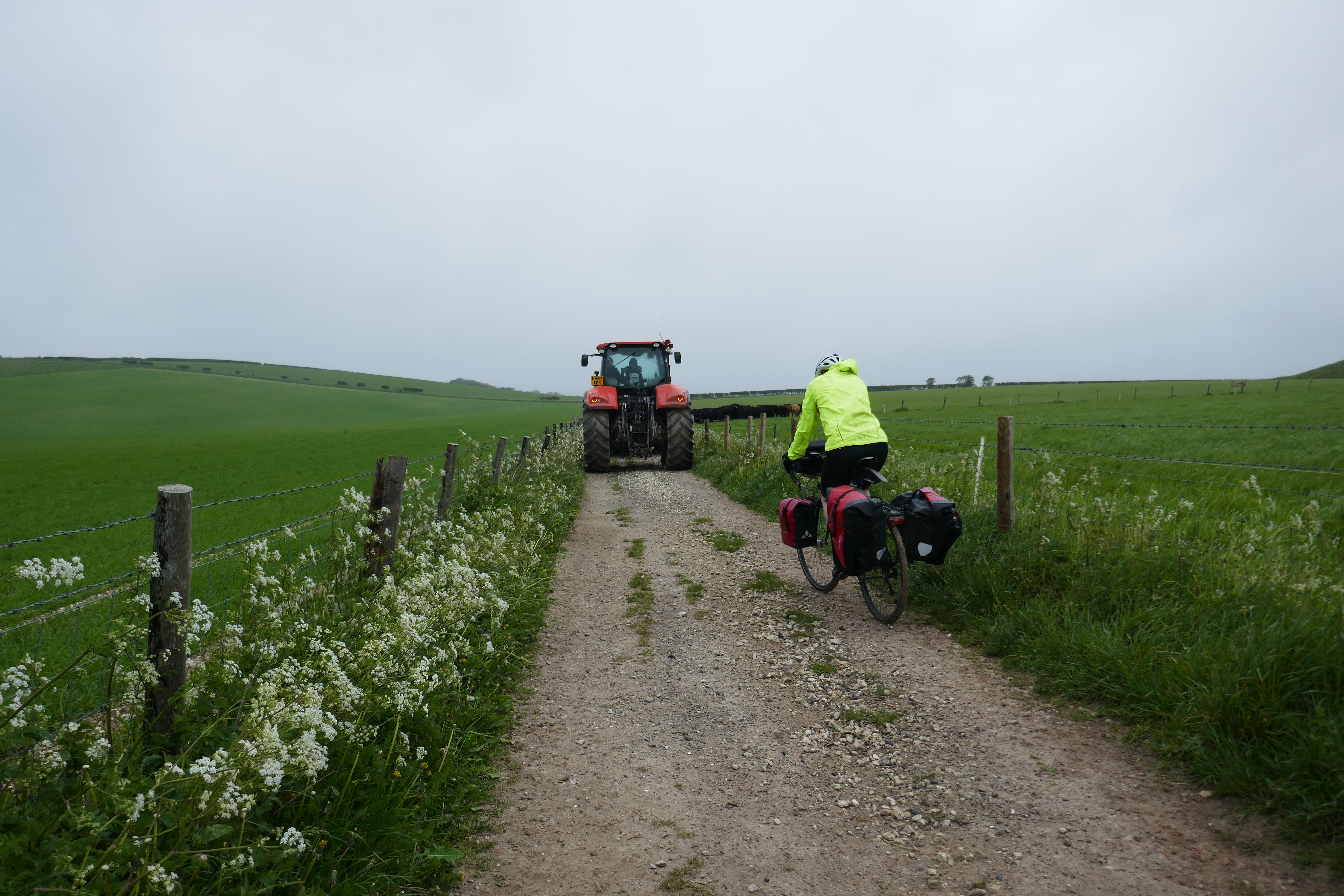 We ambled off – attempted further repairs and again the front mec on Bernie’s bike seemed fixed, but we had not taken the next 5km into account. First there were the sheep – sheep you might say – what sheep? The answer is the sheep on the only road out of Dorchester which were being steered from one field to another a mile away. So we sat behind the flock cycling at sheep pace. And as we went along slowly, so the weather got worse and the road became a track. The track bounced the bikes around and, of course, bounced Bernie’s front mec out of alignment.