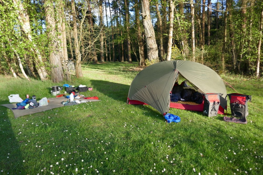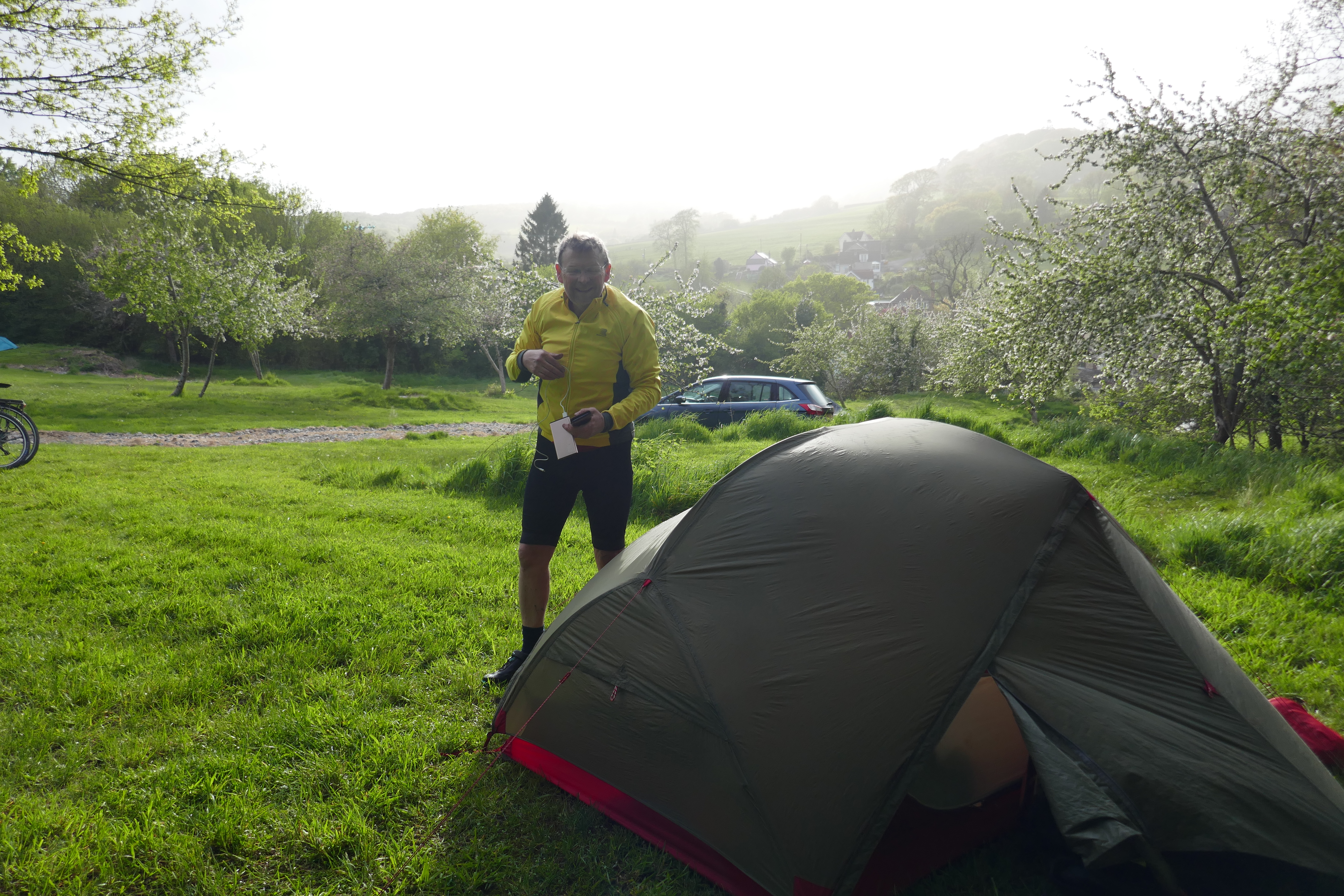 The wind howled through the night, the noise of the wind in the trees sounding like a storm at sea. We were cosily wrapped up in our tent and it felt bizarrely comforting. However, with a forecast in the morning of 35 mile an hour WSW winds – a direction that would be dead against us – and 50 mile gusts that could knock us off our bikes, we reached the limits of even our madness. One phone call to a guardian angel and our great friend Pete came to pick us up from the campsite. Before that, we re-learnt how to brew up coffee on our little stove under the fly sheet to keep the flame away from the tent sides. We gradually packed ourselves up as our camping routine kicked back into action.