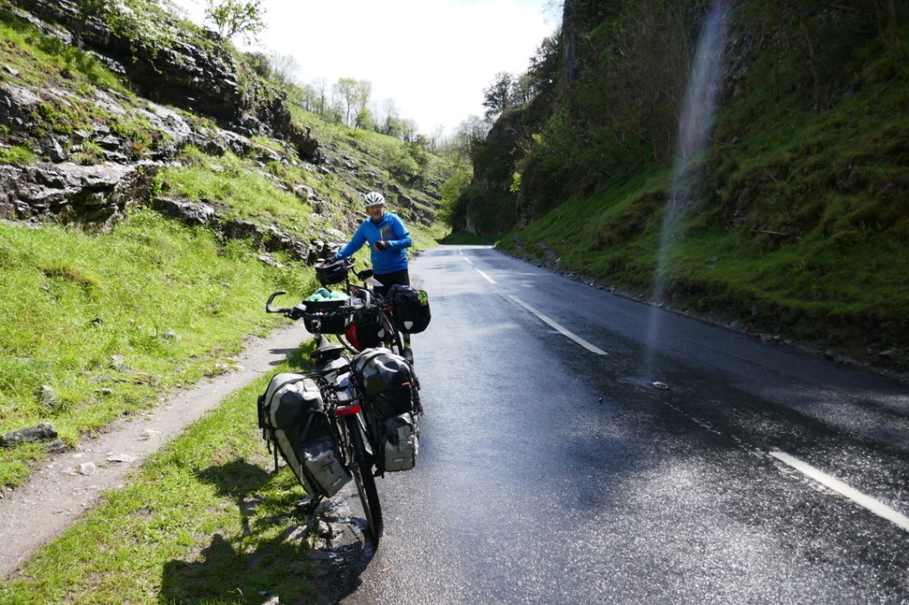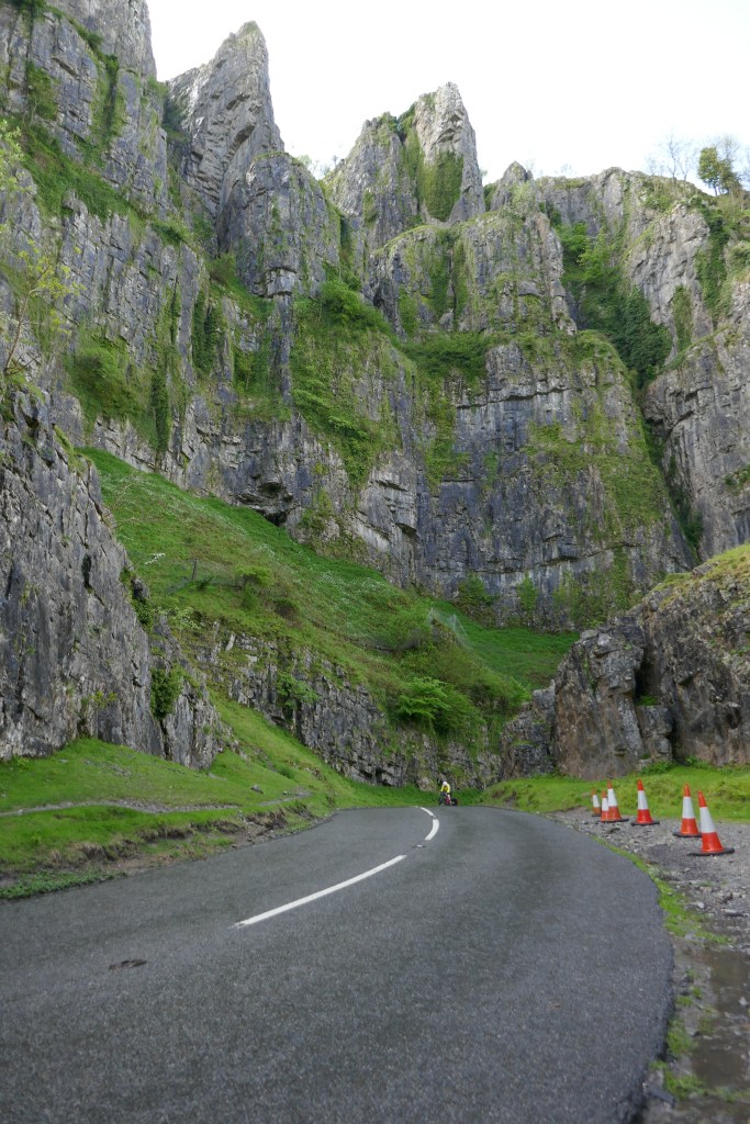 After about 28km we reached the village of Cheddar, at the base of the Mendip hills. The Mendips rise abruptly from the Somerset levels, with Cheddar Gorge cutting a line through the hills. At its base, the town of Cheddar seems mainly to be built on tourism, with the gorge as the main attraction. It had the usual array of cafes and tea shops (almost all closed), gift shops and a few other places catering for the passing hordes like us. We found one café that was open and sheltered there with coffee and an overpriced bacon sandwich whilst witnessing a cloud burst. The rain came from nowhere, fell in buckets and then it was dry again. It was quite a remarkable 10 minutes.