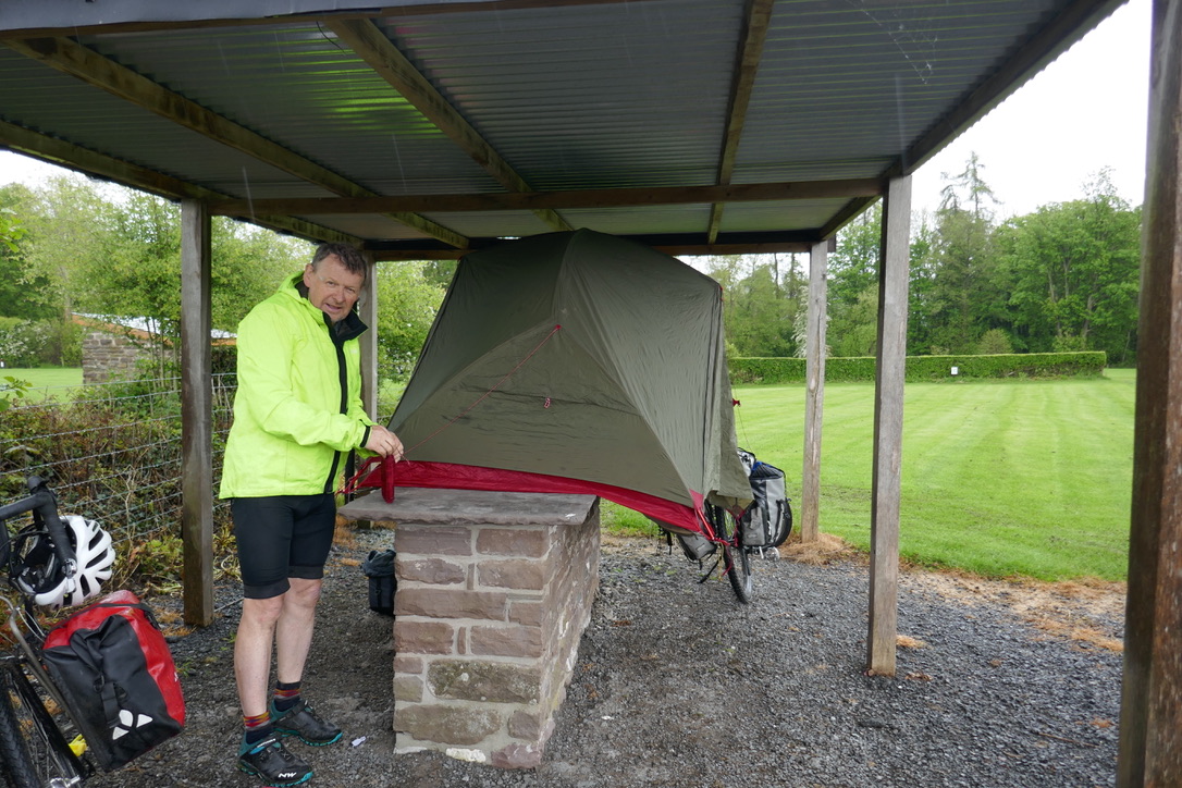 Putting up the tent under cover in the rainThe scenery – after the rain