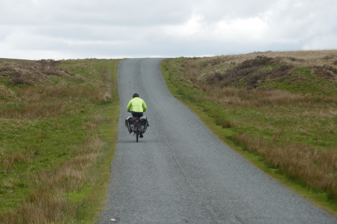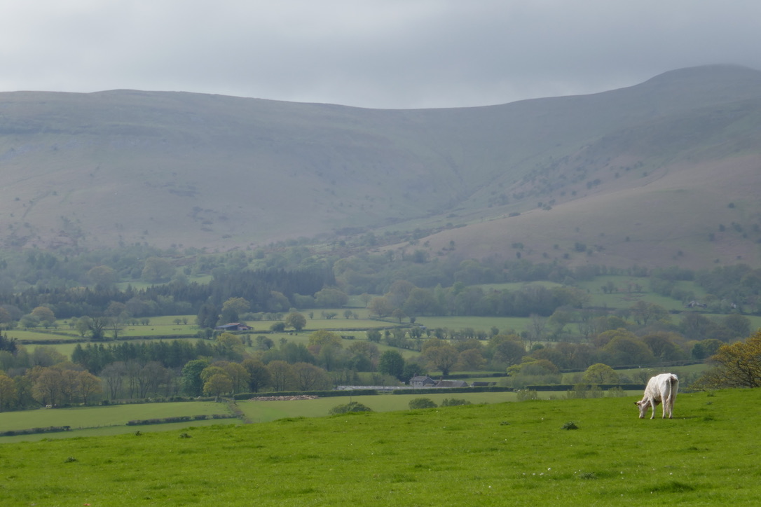 The road out of Brecon was the first climb of the day. The road was gently uphill for about 200m at about 5-7% to a lovely moor on the top where people came to walk their dogs in the stiff breeze. The rain stayed off but it was cloudy. The views from the top across to the beacons to our south were lovely, with the sun picking out parts of the green slopes.