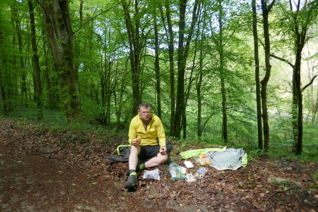 We could now enjoy the sunshine and lovely scenery on very quiet roads. We had a long slow climb up a valley by a bubbling brook through beautiful woodland listening to lovely birdsong (the road was good but empty) – such a change from the roar of traffic.