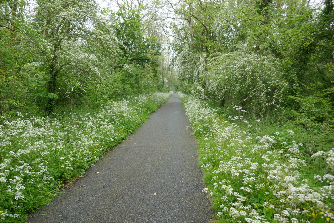 Having had a lazy day yesterday, we were surprisingly ready to get on our bikes again. We were off by about 7.30am and expected the usually tedious process of getting out of a city – but this one was straightforward. There were some sharp hills but soon we crossed the estuary and joined a delightful bike path which followed an old railway line. Lined with trees and wild flowers it climbed very gently up hill and was empty at that time of the morning.