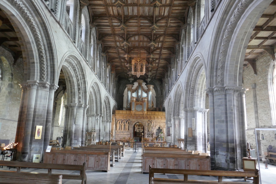 But St Davids Cathedral was a wonderful experience. In part it was the simplicity, in part the sheer size and in part it was perhaps how we were feeling. Cycling holidays tend towards looking for the good things in life, seeing beauty as opposed to seeing problems and allow time for us to understand the historical significance of historical sights. It was a light, airy building and the sun streaming in through the upper windows. It had a mixed history and was nearly a ruin by 1800, but was rescued and restored. The roof is wooden and the carvings are a joy to observe. (Bernie says one of her most favourite cathedrals ever).