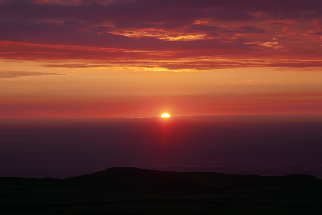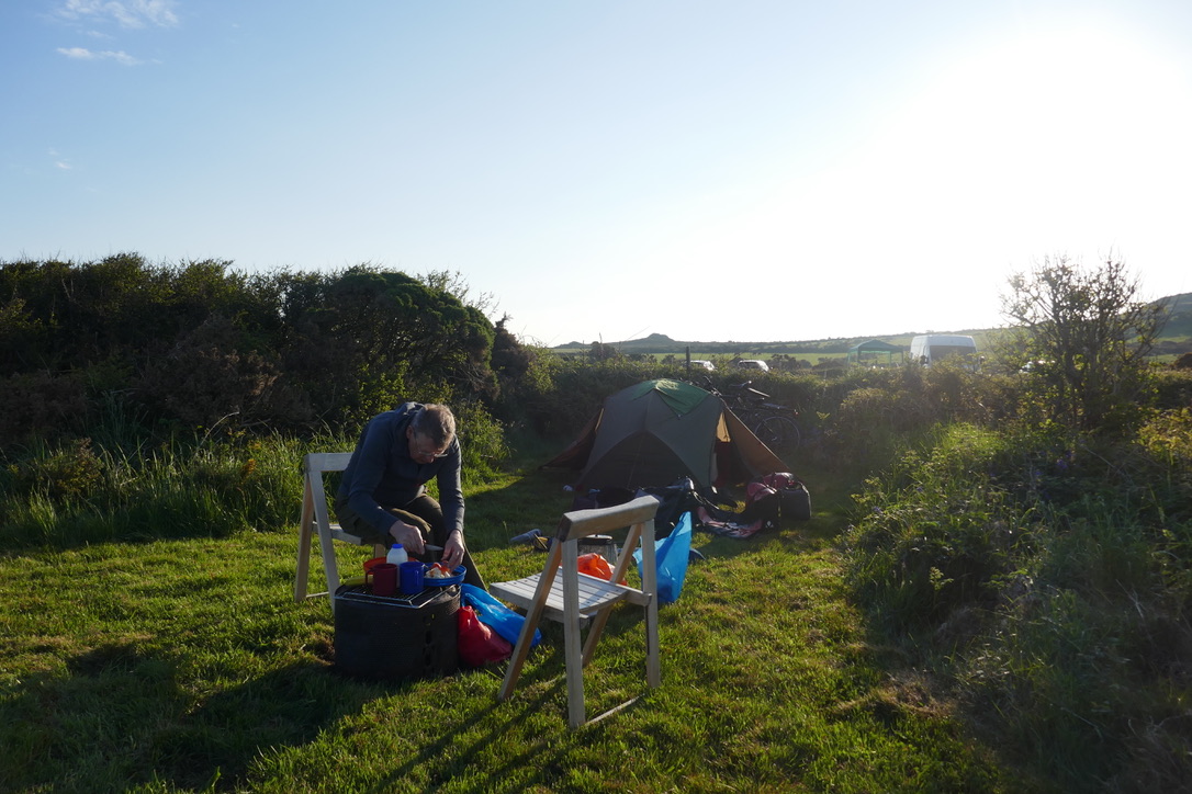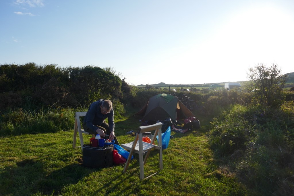 We said our goodbyes and ambled towards the Hill Fort Campsite at Trefassor. Perched high on a headland, the final km of which was up a bumpy track. This is a “green” campsite and there was loads of space. We set up and then watched a spectacular sunset over the sea. Watching the sun descend into the sea was something we had often seen abroad but never in the UK. It was mystical and made me wonder if, after giving us such a superb show, the sun would be bothered to do the whole thing again tomorrow. A superb ending to a superb day.