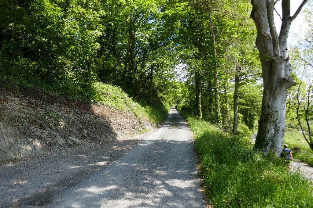 We continued up the valley to Tiverton where we paused to buy things for lunch and have a coffee at the supermarket. The next section was not as severe but still had plenty of ups and down and occasional steep sections. The roads were quiet and beautiful. If the sun was out our hearts would have been singing. As it was we stayed mostly dry until late morning and the wind was behind us but then the drizzle started and persisted for most of the rest of the day. We huddled under a convenient archway for our picnic lunch in the pretty village of Milverton – we needed it as had already done more the 800m climbing.