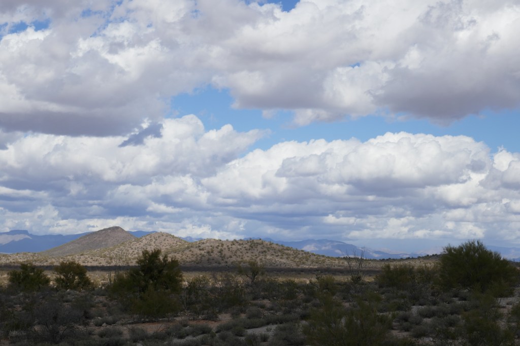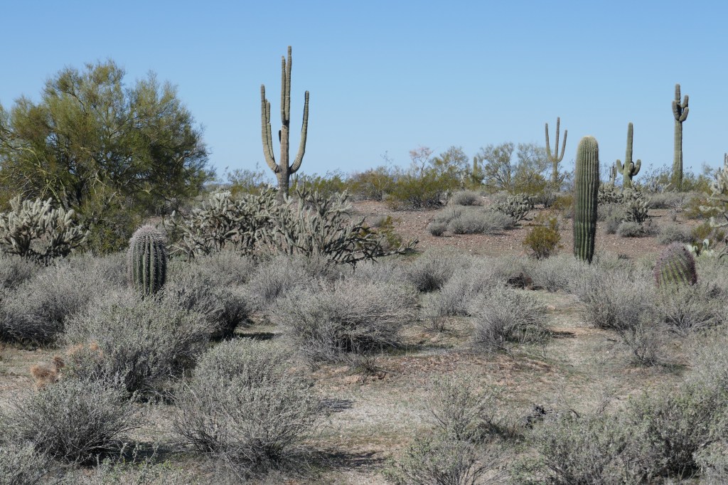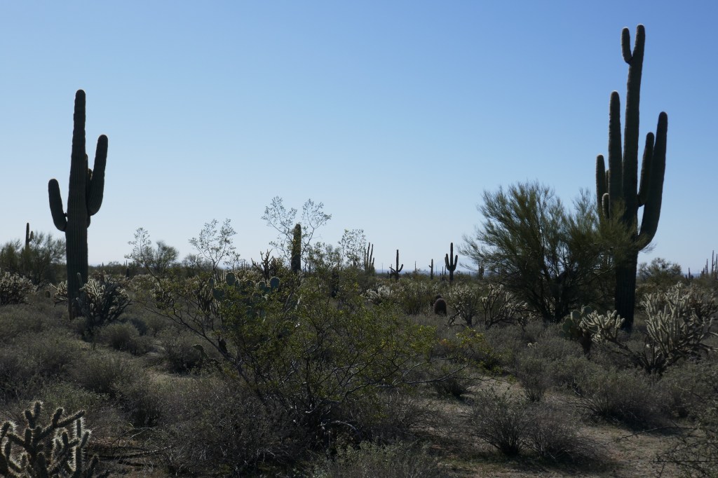 The first few miles were flat, slightly downhill and fast.  We had full cold weather gear on including full gloves and overshoes.  Gradually feeling returned to our fingers and toes.  After 9 miles we turned off the main highway 60 onto a smaller road going East, and with far less traffic.  This was part of the Sonaran desert, and was greener than the deserts in California.  It is also the only place we could see Saguaro Cacti – the tall distinctive Cacti with arms going out like a person standing to attention.