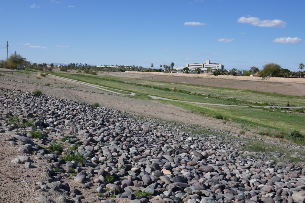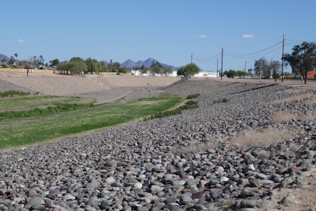 After that we pressed along and then went onto quieter roads as we entered  suburban towns north of Phoenix.  After 40 miles we stopped for something to eat at Peroria.  Then it was a final 24 miles to our warmshowers host for the evening. That was mainly along a bike track which followed a series of vast dry river beds across northern Phoenix and then along the canal.  When it rains here, the heavens must open because these are vast spaces for water – albeit bone dry at the moment.
