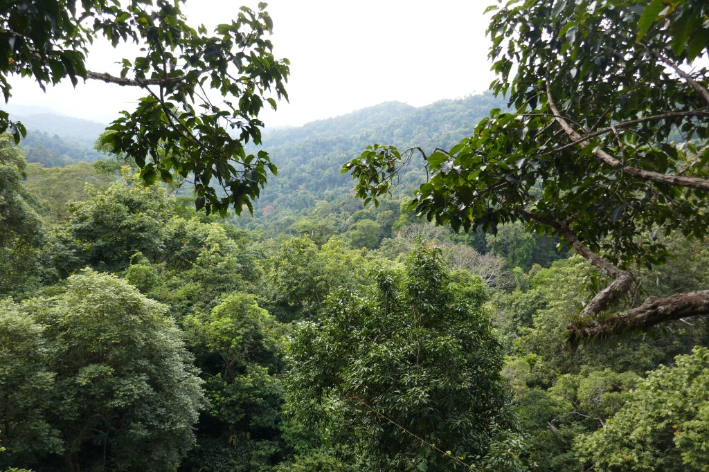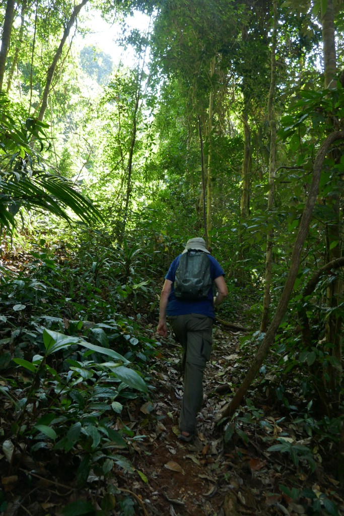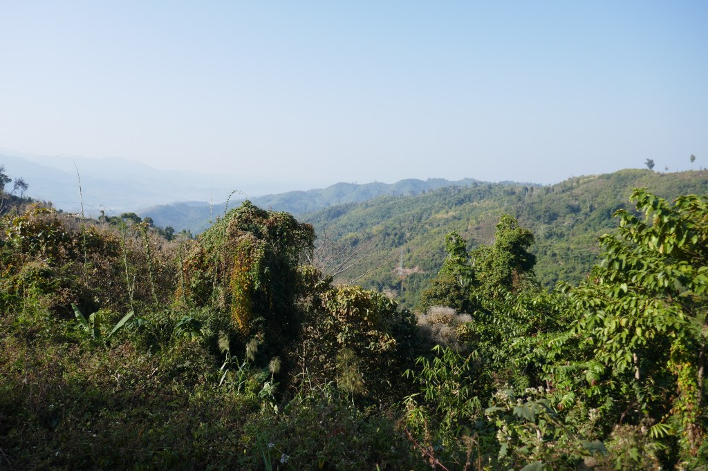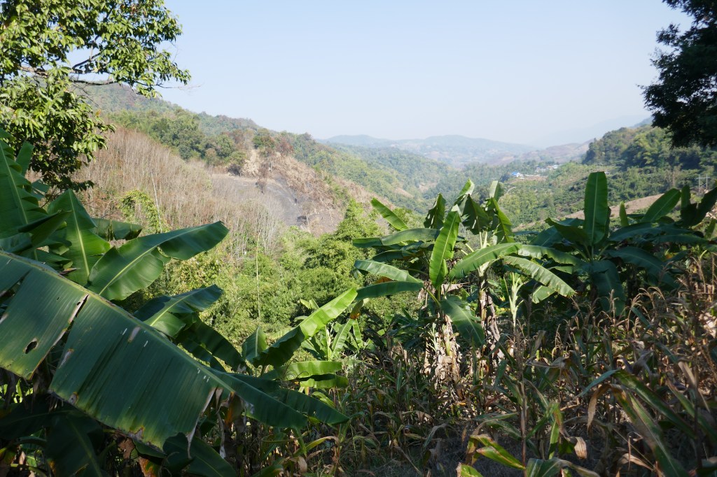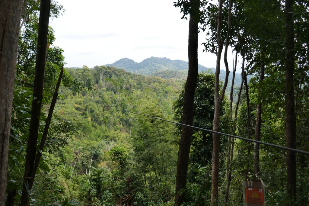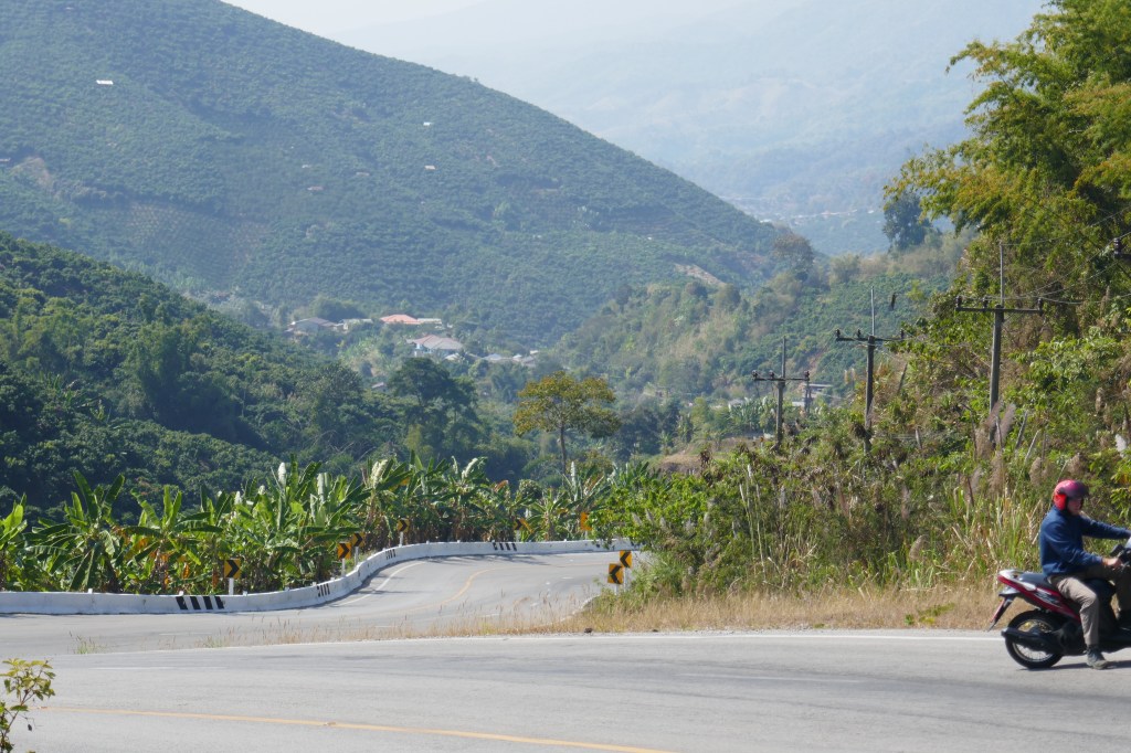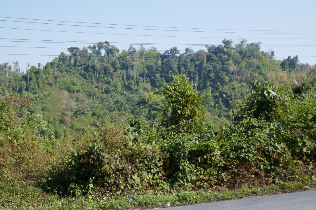 By the time we had finished the hard boiling (David tried to insist on a full 10 minutes but we compromised at 8 on the basis the eggs would continue to cook in their shells), the sun had risen and some of the mist had burned off. Within a few kms we started our first climb of the day which we knew from Kamoot was about 400m of climbing. We were feeling surprisingly good after yesterday’s long day and soon we were into the familiar territory of bottom gear and plodding slowly up, meters climbed being much more important than distance covered. Most of the climb was 8/9% so tough but not excruciating. We felt our fitness now coming to the fore and could keep going without too many rest stops. The scenery was lovely and the road was quiet – a vehicle every 5 minutes or so at that time of the morning. On the lower part of the climb a lot of the hillsides were cleared for agriculture. They seemed impossibly steep to grow anything and were bare at this time of year, but no doubt spring into life when the rains come. As we got higher, the jungle took over again and views back down the valley appeared.