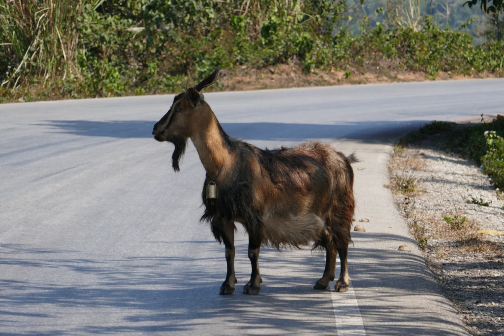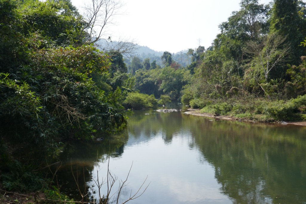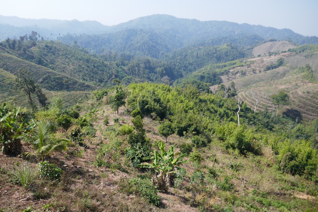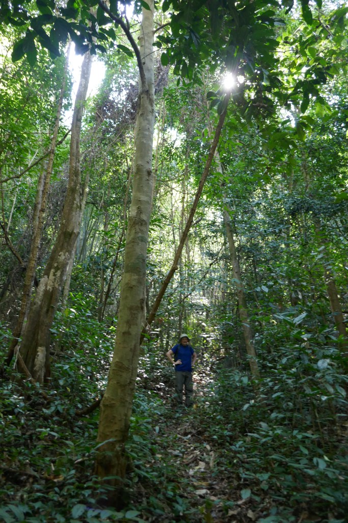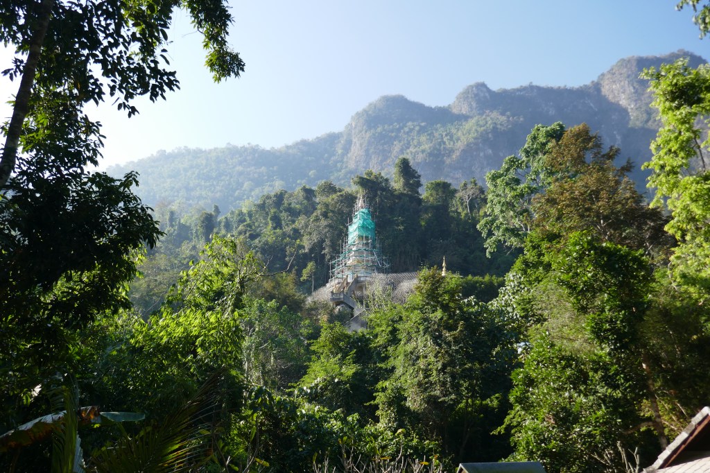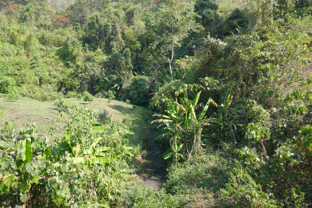 By the time we had finished the hard boiling (David tried to insist on a full 10 minutes but we compromised at 8 on the basis the eggs would continue to cook in their shells), the sun had risen and some of the mist had burned off. Within a few kms we started our first climb of the day which we knew from Kamoot was about 400m of climbing. We were feeling surprisingly good after yesterday’s long day and soon we were into the familiar territory of bottom gear and plodding slowly up, meters climbed being much more important than distance covered. Most of the climb was 8/9% so tough but not excruciating. We felt our fitness now coming to the fore and could keep going without too many rest stops. The scenery was lovely and the road was quiet – a vehicle every 5 minutes or so at that time of the morning. On the lower part of the climb a lot of the hillsides were cleared for agriculture. They seemed impossibly steep to grow anything and were bare at this time of year, but no doubt spring into life when the rains come. As we got higher, the jungle took over again and views back down the valley appeared.