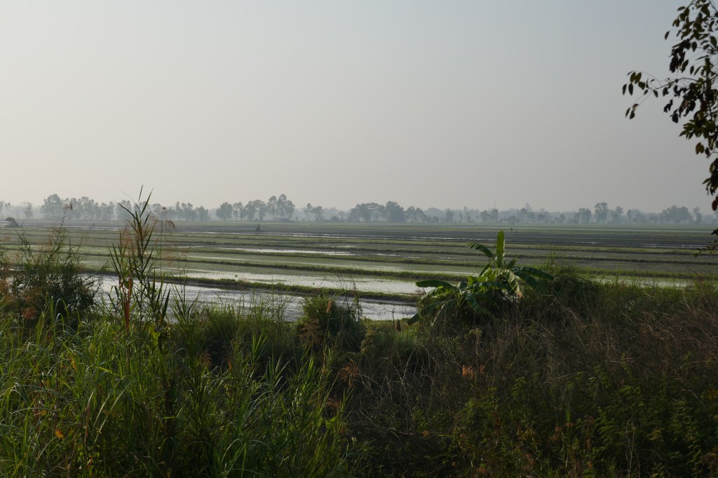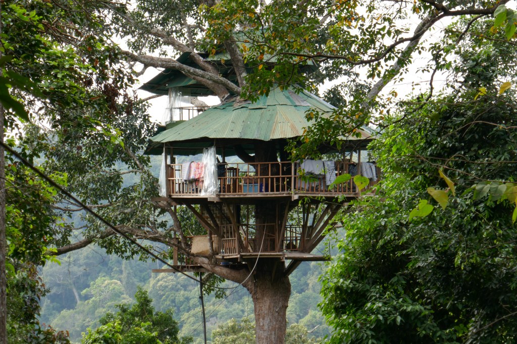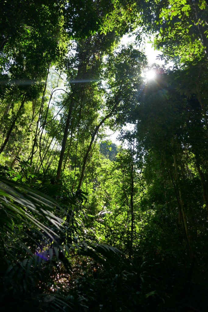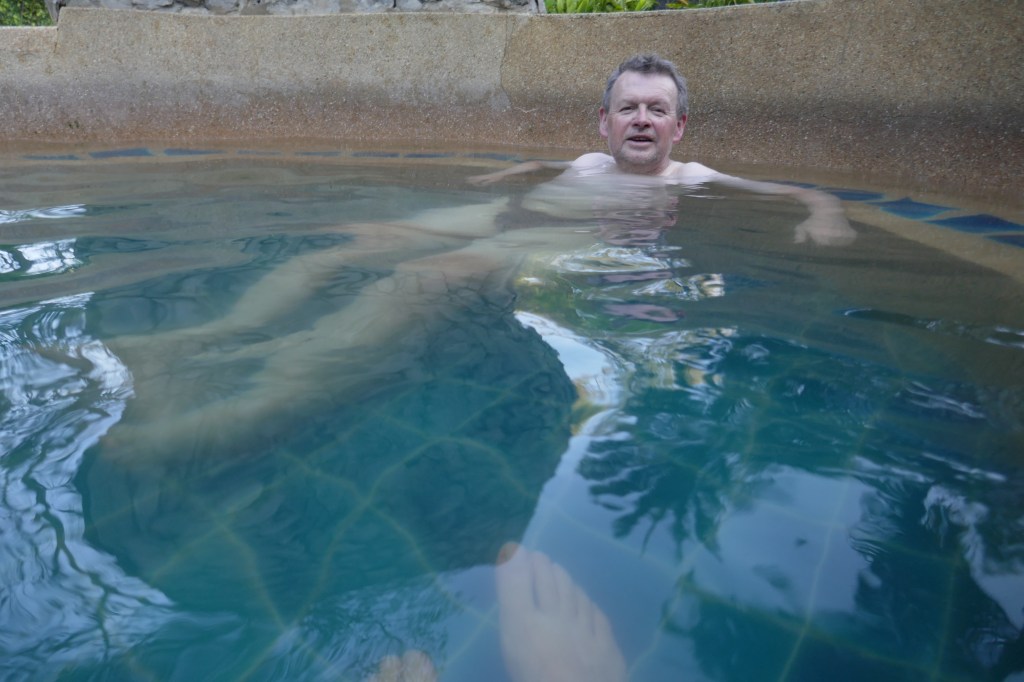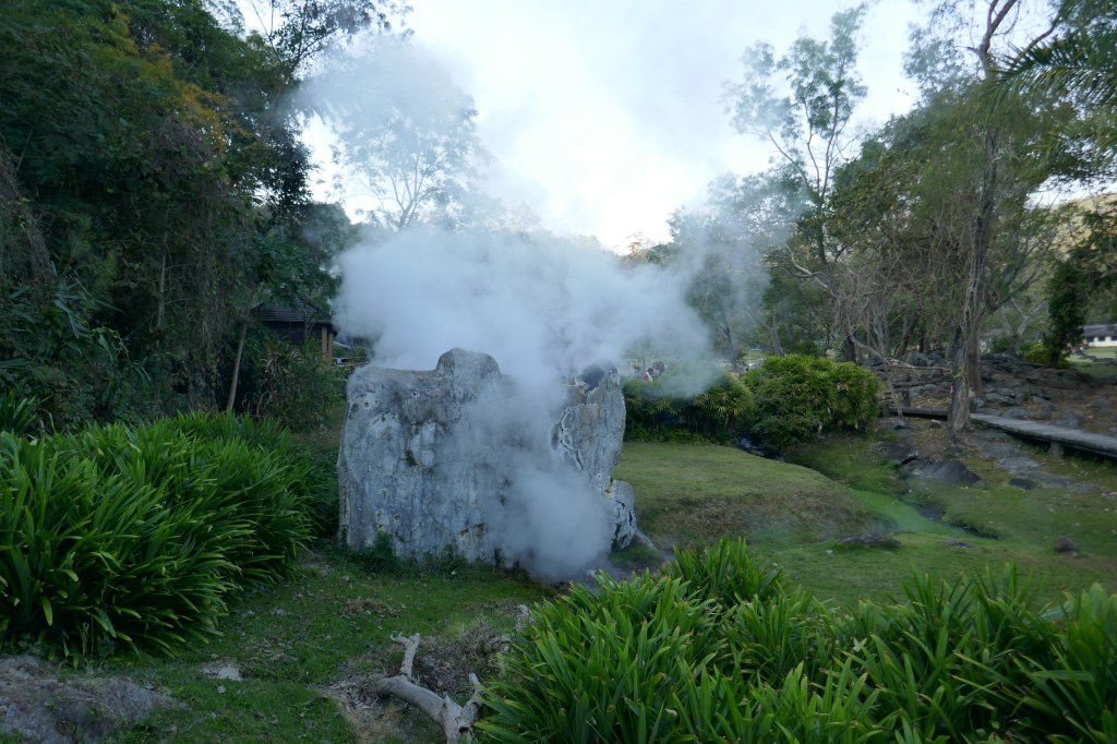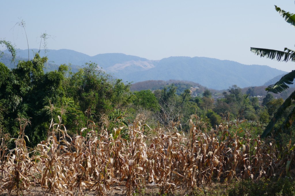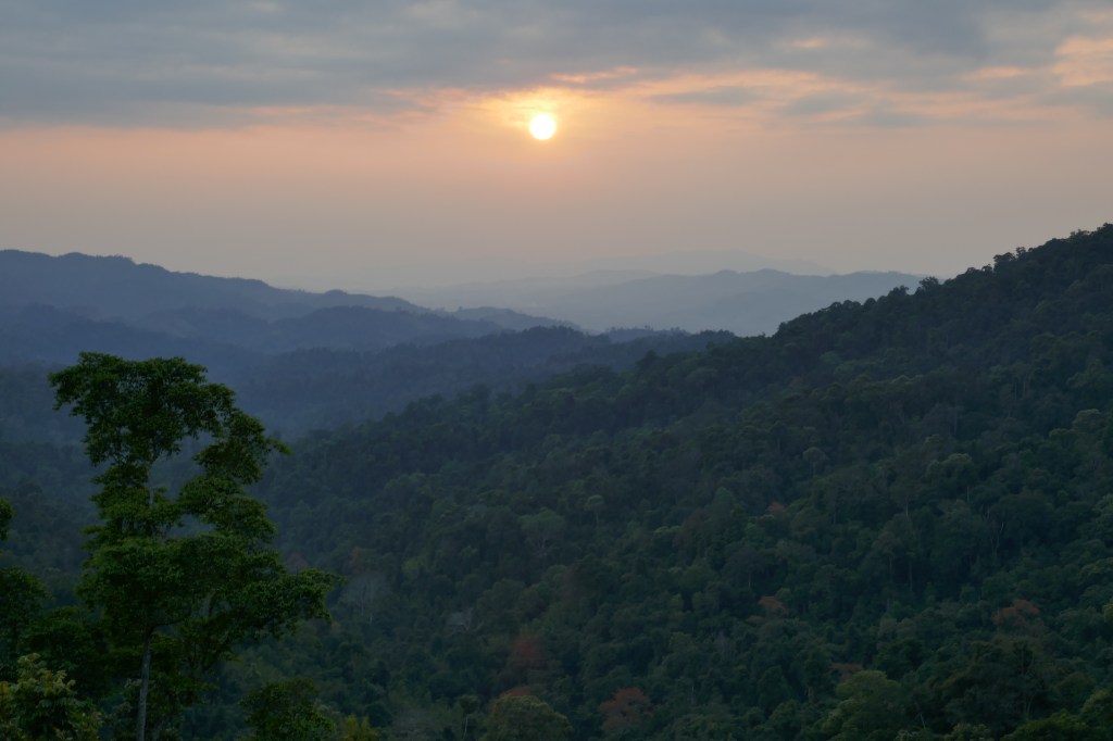 By the time we had finished the hard boiling (David tried to insist on a full 10 minutes but we compromised at 8 on the basis the eggs would continue to cook in their shells), the sun had risen and some of the mist had burned off. Within a few kms we started our first climb of the day which we knew from Kamoot was about 400m of climbing. We were feeling surprisingly good after yesterday’s long day and soon we were into the familiar territory of bottom gear and plodding slowly up, meters climbed being much more important than distance covered. Most of the climb was 8/9% so tough but not excruciating. We felt our fitness now coming to the fore and could keep going without too many rest stops. The scenery was lovely and the road was quiet – a vehicle every 5 minutes or so at that time of the morning. On the lower part of the climb a lot of the hillsides were cleared for agriculture. They seemed impossibly steep to grow anything and were bare at this time of year, but no doubt spring into life when the rains come. As we got higher, the jungle took over again and views back down the valley appeared.